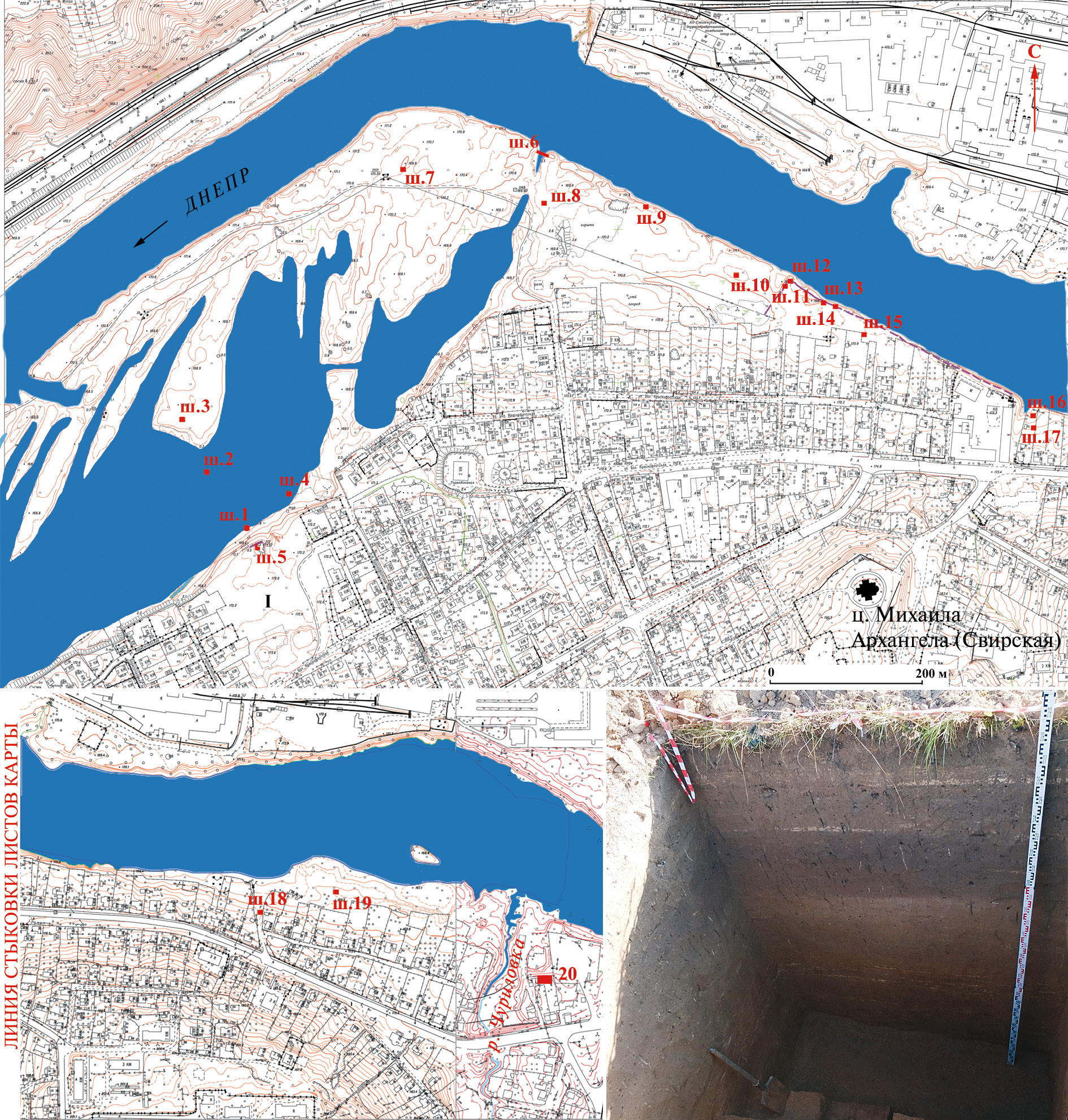 Двигаясь вверх по течению Днепра, мы попадаем на участок между устьями Свирского ручья и речки Чуриловка. Русло Днепра образует здесь излучину, обращенную вершиной на север. Вероятно, смещение русла Днепра на север частично связано с давлением с юга обширного конуса выноса Чуриловки (рис. 1, 1). Современная поверхность в районе и ниже устья Чуриловки имеет отметки 167–170 м БС. Шурф 18, заложенный на опирающемся на пойму уступе террасы на отметке 171.5 м, дал следующую стратиграфию: 0–80 см – мешаный культурный слой, включающий керамику XVI в. и современные остатки; 80–100 см – темно-серый суглинок с углями (культурный слой) с преобладанием материалов XII – XIII вв.; 100–120 см –материк: бурый суглинок кровли первой террасы, имеющей отметку около 170 м БС.
