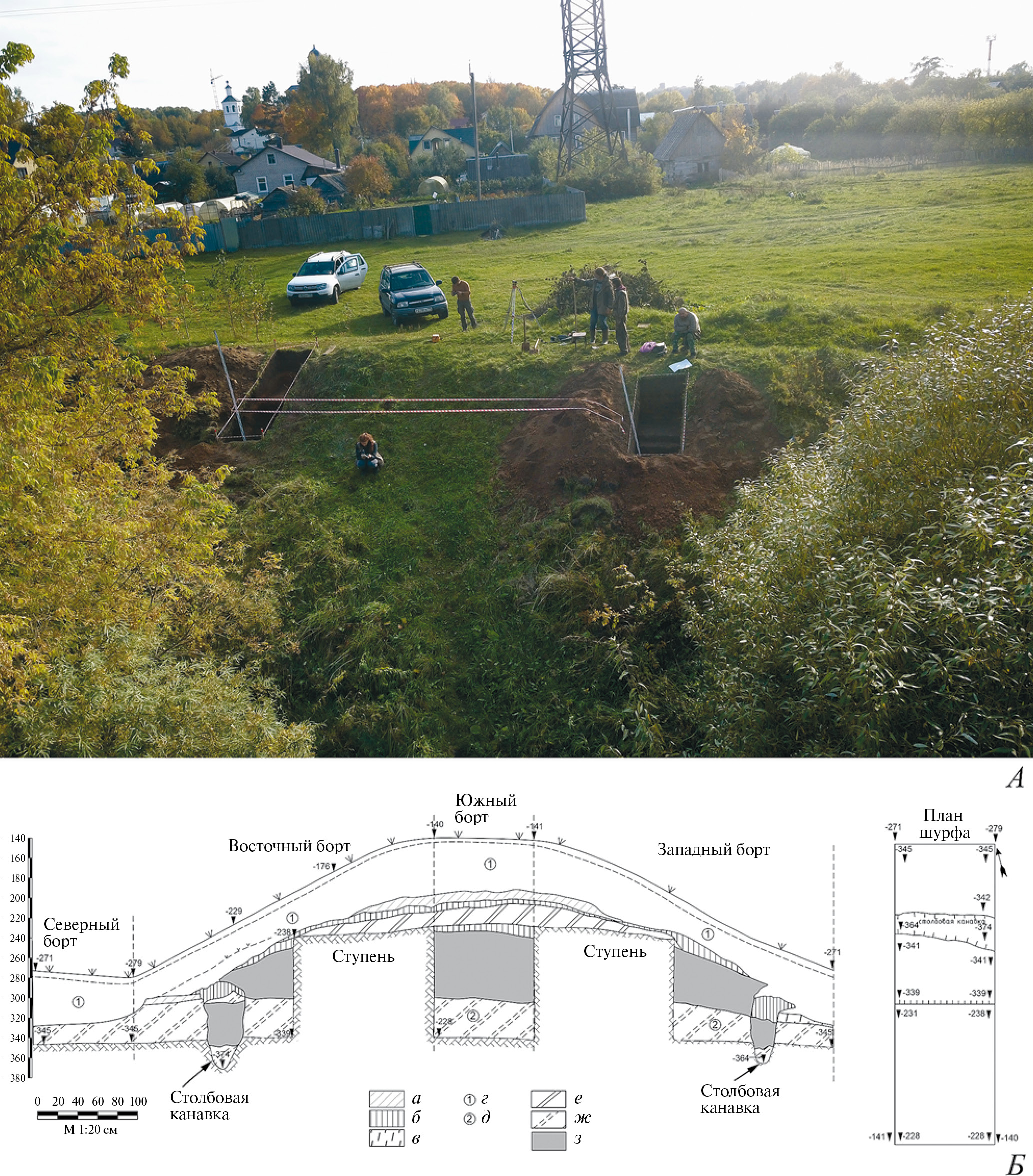 Рис. 4. А – трасса стены Посада XII в. вдоль берега Днепра (показана сигнальной лентой) на фото с квадрокоптера, на заднем плане – Свирская церковь Михаила Архангела; Б – профиль бортов и план шурфа 14. Условные обозначения: а – темно-серая супесь; б – светло-бурая супесь; в – серая супесь; г – серо-бурая супесь; д – слоистый бурый суглинок с линиями аллювия; е – бурая супесь; ж – бурый суглинок; з – темно-бурый суглинок