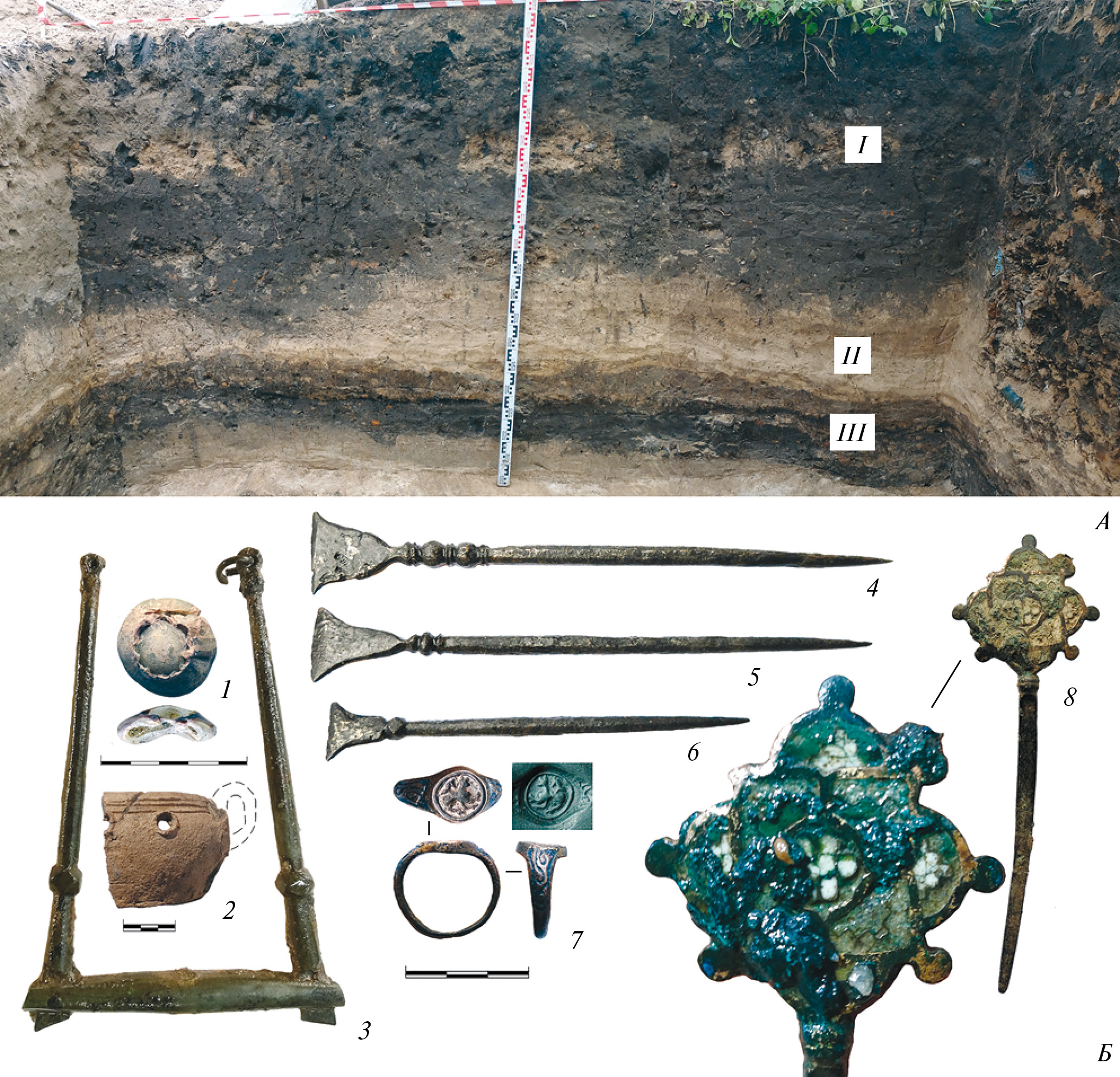 Рис. 7. А – разрез восточного борта шурфа 2020 г. на ул. Соболева, 49 (перекресток с ул. Песочной): I – песчано-галечный нанос 1908 (?) г.; II – песчаный нанос XIII – XV вв.; III – культурный слой XI – XIII вв.; Б – находки из нижнего древнерусского слоя: 1 – основание стеклянного сосуда; 2 – глиняная кацея-кадило; 3 – бронзовые весы для малых взвешиваний; 4–6 – железные писала; 7 – перстень из медного сплава с позолотой и синей эмалью; 8 – булавка из медного сплава с квадрифолийным навершием с перегородчатой эмалью