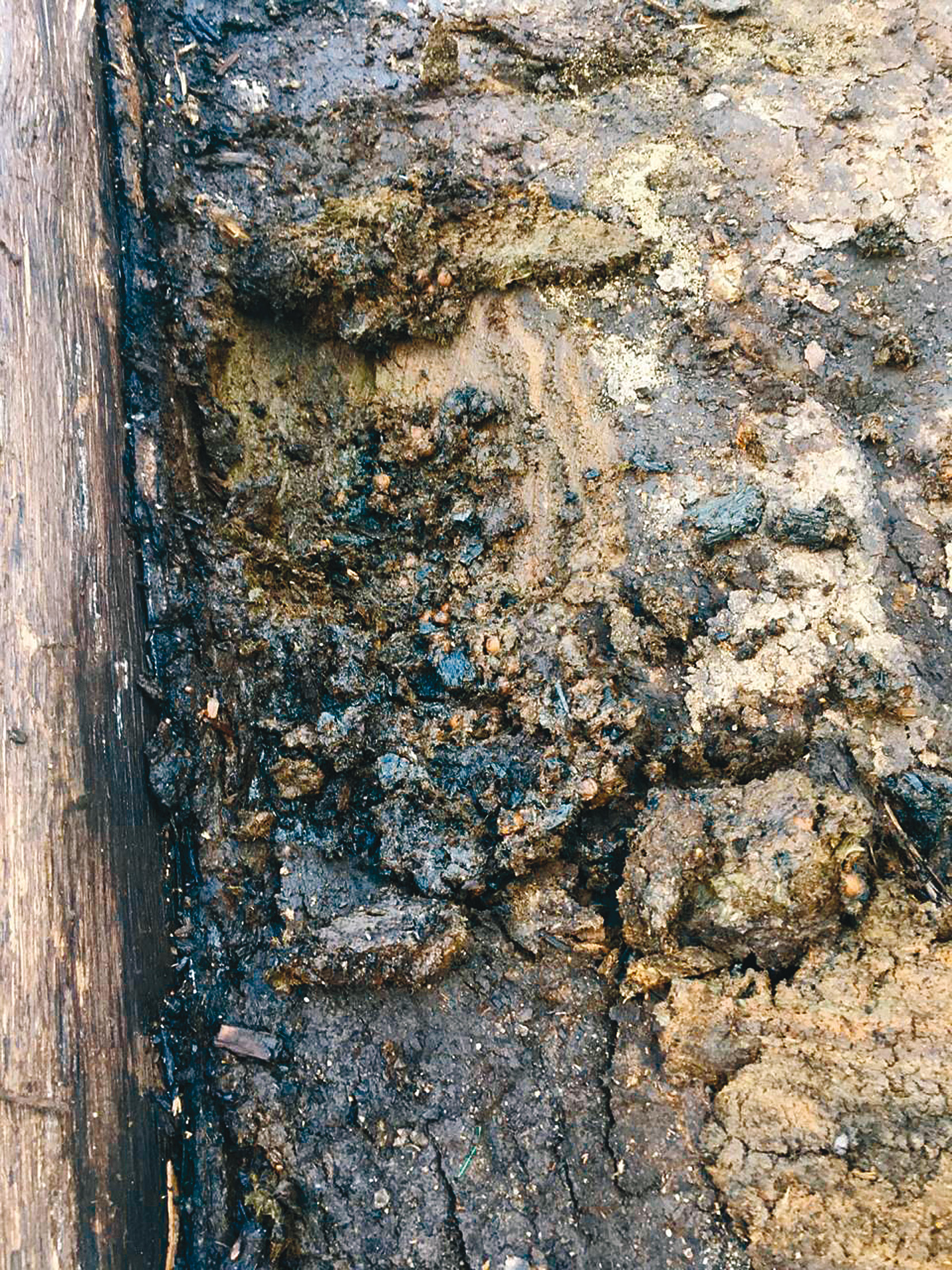 Рис. 2. Раскоп на ул. Боркова. Участок 3, уровень зачистки −610 см. Заполнение городни с визуально различимыми косточками вишни