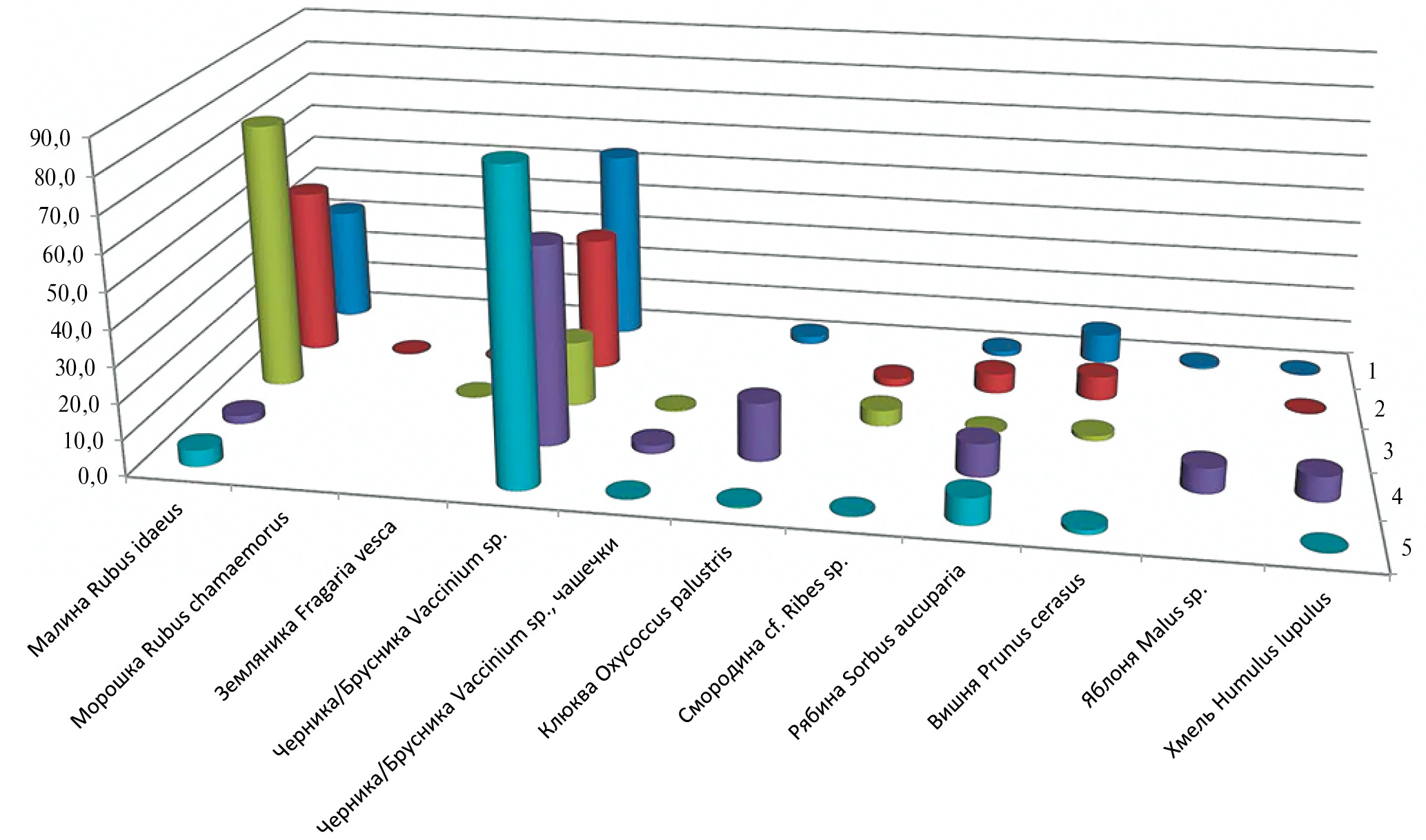 Fig. 5. Berry and fruit-bearing plants: content of macroremains in samples, %