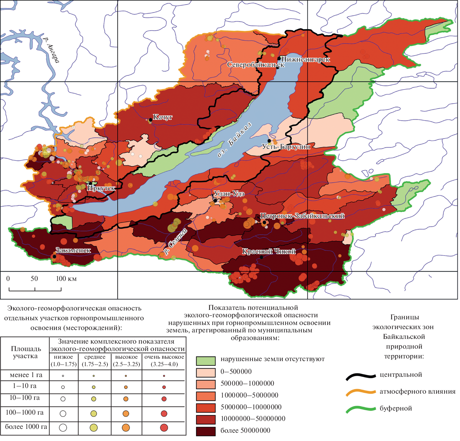 A method for calculating the complex index of the eco-geomorphological hazard of mining territories according to their influence on the ecological situation in the Baikal region is proposed. The described approach makes it possible to characterize in detail the consequences of mining for the ecological situation in the region. The proposed assessment takes into account not only the area of disturbed lands, but also other factors affecting the possibility of transport of pollutants and the degree of their hazard (in particular, the type of raw material extracted, the geomorphological position of the mining territories, the degree of the anthropogenic transformation of landscapes, the composition of anthropogenic deposits and the degree of reclamation of disturbed lands). To test the methodology, the complex index of the eco-geomorphological hazard of lands disturbed by mining was calculated for municipalities of the Baikal region for 2020. Municipalities were ranked according to the value of the complex index and a corresponding map was compiled.