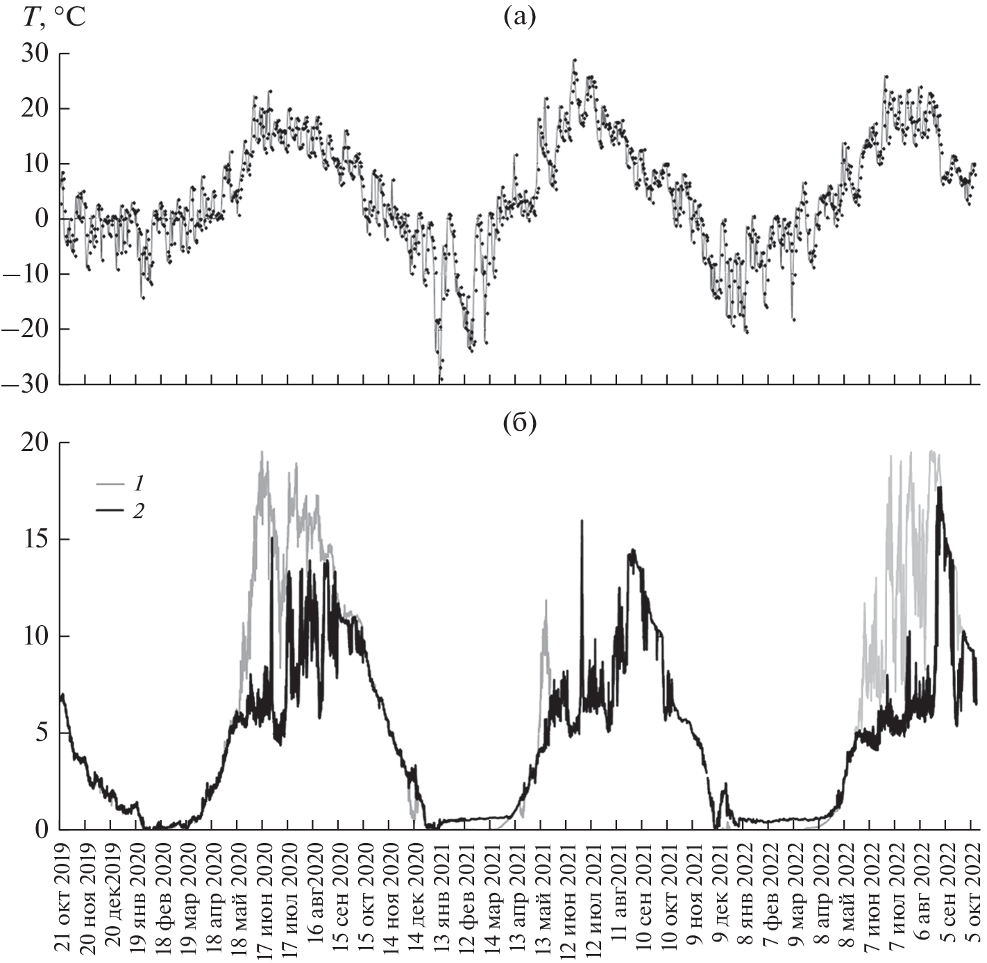 По круглогодичным измерениям температуры воды на автономной станции (заякоренной косе с температурными датчиками) изучены особенности температурного и ледового режимов Петрозаводской губы Онежского озера в современных климатических условиях, уточнены даты и продолжительность основных гидрологических явлений на акватории губы. В аномально теплую зиму 2019–2020 гг. акватория Петрозаводской губы не покрылась льдом полностью впервые за длительный период наблюдений, в районе станции измерений ледовые поля периодически наблюдались с конца января до середины марта. Продолжительность ледостава в две следующие зимы составила 3.5 и 5 мес. Получены данные о сроках начала и продолжительности весенней подледной конвекции, феномена, играющего важную роль в термическом режиме озера в конце зимы. Показано, что 2016, 2021 и 2022 гг. весеннее подледное конвективное перемешивание продолжалось 4–6.5 нед., охватывая к концу ледостава весь столб воды. Перемешивание водной толщи после взлома льда (весенняя гомотермия) продолжалось еще 3–4 нед. Весной 2020 г. подледная конвекция не наблюдалась, перемешивание в условиях отрытой воды продолжалось два месяца с середины марта до середины мая. Даты перехода температуры воды через 4°C в сторону повышения в годы измерений (5–19 мая) опережали среднемноголетние на 2–3 нед. (конец мая). Термическая стратификация устанавливалась в годы измерений в период с 12 по 27 мая, раньше среднемноголетних сроков (начало июня), и существовала 3–3.5 мес. Полное перемешивание водной массы губы происходило в конце августа–начале сентября, и далее до установления льда водная толща охлаждалась в состоянии гомотермии с редкими эпизодами установления слабой стратификации. Непосредственно перед установлением льда температура воды понижалась до очень низких значений и не превышала 0.1°C по столбу воды. Период со среднесуточной температурой воды поверхностного слоя Петрозаводской губы выше 10°C продолжался в годы измерений от 121 до 144 сут.