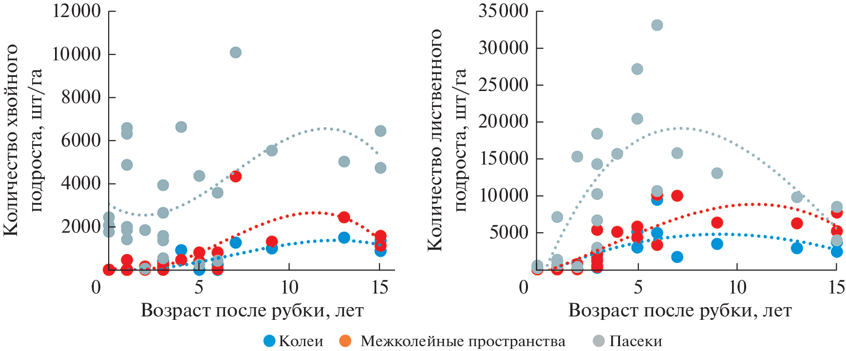 —The article presents materials for studying the physical properties of the upper horizons of the soil, the species diversity of the living ground cover and the natural regeneration of trees in 1–15 years old clear-cuttings. A noticeable compaction of the soil is observed in the ruts of the passage of machines, mainly in the thickness of the soil 0–10 cm, but not in the between ruts sand the cutting strips. We found that the physical properties (bulk density, total porosity and aeration porosity) of the upper soil horizons depend on the age of cutting and the study site (p < 0.01). Soil compaction in the ruts decreases 9–15 years after logging to indicators in sites where the movement of machines was not carried out. The overgrowth of damaged sections in clear-cuts occurred through ruderal species and species with wide ecological amplitudes to environmental factors. This overgrowth stabilised 15 years after logging when the biodiversity level approached untouched stands. The regeneration of clear-cuts is mainly deciduous such as birch and aspen that mainly grew in the cutting strips. In the ruts and the between ruts, the amount of undergrowth is 2–7 times less than in cutting strips.