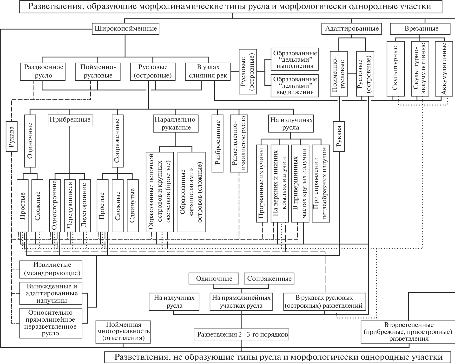 На основе многолетних исследований дано обоснование полной классификации разветвлений, образующих морфологически однородные участки в разных геолого-геоморфологических условиях, которые формируются в рукавах разветвлений разных структурных уровней и в руслах других морфодинамических типов. Анализ условий формирования разветвлений речных русел, их морфологии, деформаций и переформирований показал, что в классификации необходимо учитывать структурные уровни разветвлений и их морфодинамические типы; отдельно выделять разнообразие разветвлений в извилистом русле, формирующих типы русла или морфологически однородные участки; учитывать единичные разветвления на излучинах, в прямолинейном русле и в рукавах разветвлений; выделять пойменную многорукавность, второстепенные прибрежные или приостровные разветвления, а также разветвления второго и третьего порядков. Рукава русловых (островных) разветвлений могут представлять собой пологие излучины, шпорами которых являются острова; прямолинейное русло; разветвления второго-третьего порядков, совокупность которых создает в рукавах разные типы разветвления. Разработка классификации разветвлений, как и в целом ранее предложенной авторами морфодинамической классификации речных русел, дает возможность ее дорабатывать по мере изучения разветвлений речных русел, создавать в ней новые уровни (блоки), позволяющие учесть все большее морфологическое и динамическое разнообразие разветвлений и условий их формирования.