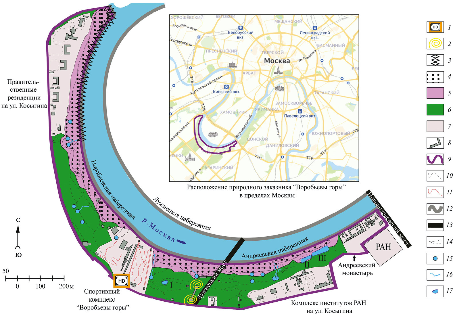 Территория исследования. Природный заказник «Воробьевы горы» расположен на границе Западного и Юго-Западного административных округов Москвы и тянется узкой полосой (протяженность около 4 км, ширина от 100 до 400 м) вдоль правого берега р. Москвы от устья р. Сетунь до Третьего транспортного кольца. Границы заказника проходят по транспортным магистралям и по набережной р. Москва, связь с другими объектами экологического каркаса города, такими как «Нескучный сад» и «Долина реки Сетунь», отсутствует. Площадь заказника составляет 137.5 га. В 1987 г. Воробьевы (тогда Ленинские) горы были объявлены памятником природы геологического характера, а в 1998 г. получили статус природного заказника. Однако в 2013 г. постановлением Правительства Москвы территория заказника была передана в безвозмездное пользование ЦПКиО «Парк Горького», что ознаменовало изменение вектора использования территории с природоохранного на рекреационный.