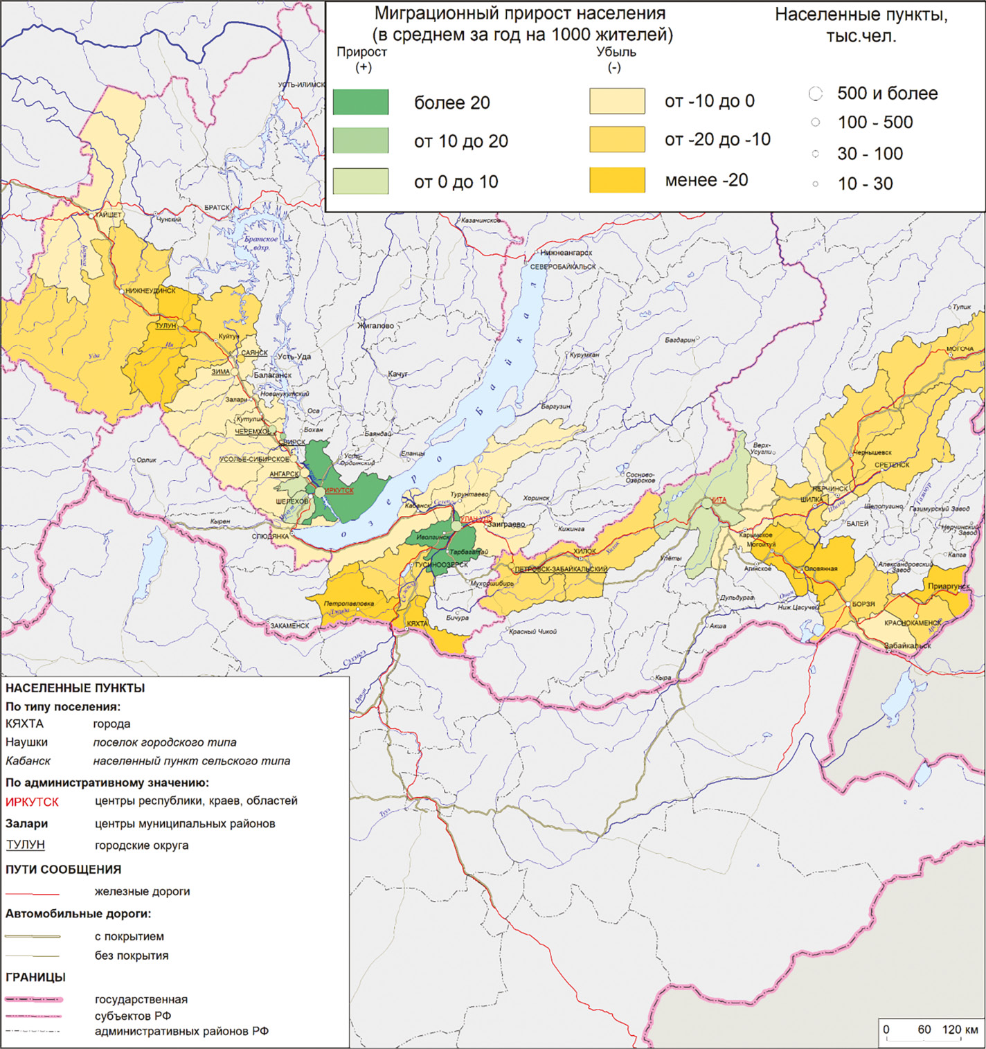 Влияние Транссибирского транспортного коридора проявляется весьма отчетливо — примагистральные территории в целом теряли население только в Забайкальском крае (–6.6‰ в год), а Иркутская область и Бурятия имели прирост населения 1.2 и 4.4‰ в год соответственно. В Бурятии прирост населения вдоль Транссиба был обеспечен на 4/5 естественным приростом населения. В Забайкальском крае миграционный отток на примагистральных территориях был 7.5‰ в год, а на внемагистральной периферии –20.4‰ в год.