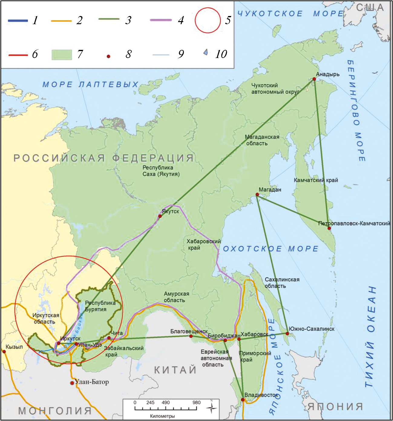 Key tourist routes: 1 — Baikal–Khubsugul, 2 — The Great Tea Route, 3 — The Eastern Ring of Russia; 4 — Baikal–Alaska. In the footsteps of the Amur expedition of 1849–1855; 5 — the Baikal macroterritory; 6 — the border of the Republic of Buryatia; 7 — the territory of the Far Eastern Federal District; 8 — the centers of the subjects of the Russian Federation; 9 — the main rivers; 10 — lakes.