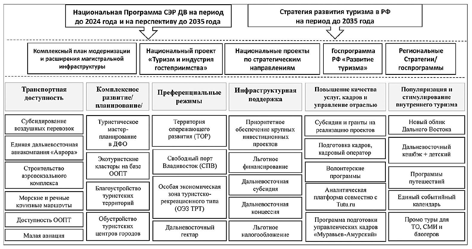 Базовые подходы к формированию и реализации региональной туристской политики, установленные в государственных документах, включают: системный подход, предполагающий взаимосвязанные и взаимопроникающие системные изменения в туристском секторе региона, начиная с концептуального планирования (мастер-планы) и завершая продвижением турпродукта; комплексные инструменты поддержки развития туристских дестинаций; сквозной характер оказания мер государственной поддержки; конкурсный отбор региональных инициатив/проектов/ мероприятий; межведомственную и межрегиональную синхронизацию планов развития [11]. Сегодня регионы ДФО активно совершенствуют региональную политику по развитию туризма, используя прогрессивные инструменты государственного регулирования и поддержки развития туризма, установленные в стратегических и программных документах, национальных проектах РФ (рис. 2).