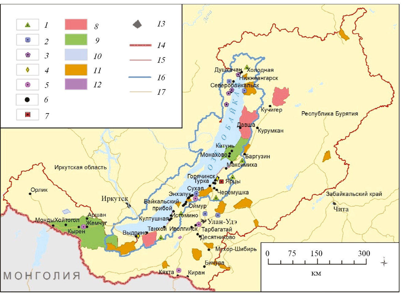 Forms of territorial organization of tourist and recreational activities: 1 — leased forest areas, 2 — zones of economic favorability; 3 — places of mass recreation, 4 — territories of advanced development, 5 – tourist clusters, 6 — tourist–oriented settlements, 7 — SEZ TRT «Baikal Harbor»; specially protected natural areas, 8 — nature reserves, 9 — national parks, 10 — natural parks, 11 — nature reserves, 12 — recreational areas; 13 — the centers of the subjects of the Russian Federation, 14 — the state border, 15 — the border of the subjects of the Russian Federation, 16 – the border of the central ecological zone of the Baikal natural territory.