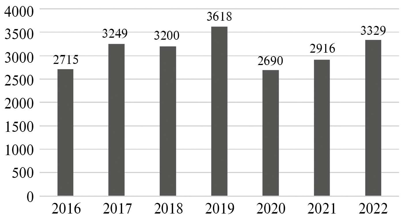 Fig. 6. Number of employees in the tourism sector in the Republic of Buryatia for 2016–2022, people. Compiled by [26].