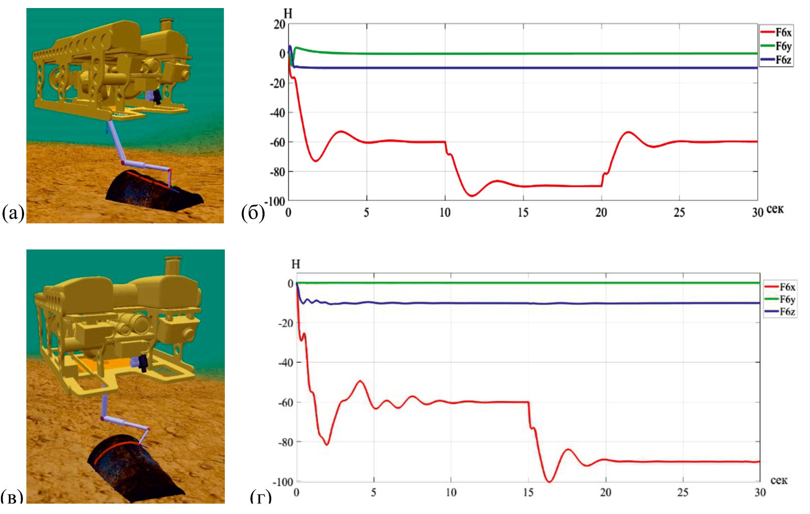Из графиков, представленных на рис. 5, б, г, видно, что после завершения переходных процессов рабочий инструмент ММ воздействовал на поверхность объекта с заданными усилиями (рис. 5, б, г, красная кривая) на протяжении всей траектории движения. При этом на движущийся инструмент воздействовало также тангенциальное усилие (рис. 5, б, г, синяя кривая), характеризуемое силой трения, возникающей между инструментом и поверхностью объекта работ, и действующее против направления движения инструмента.