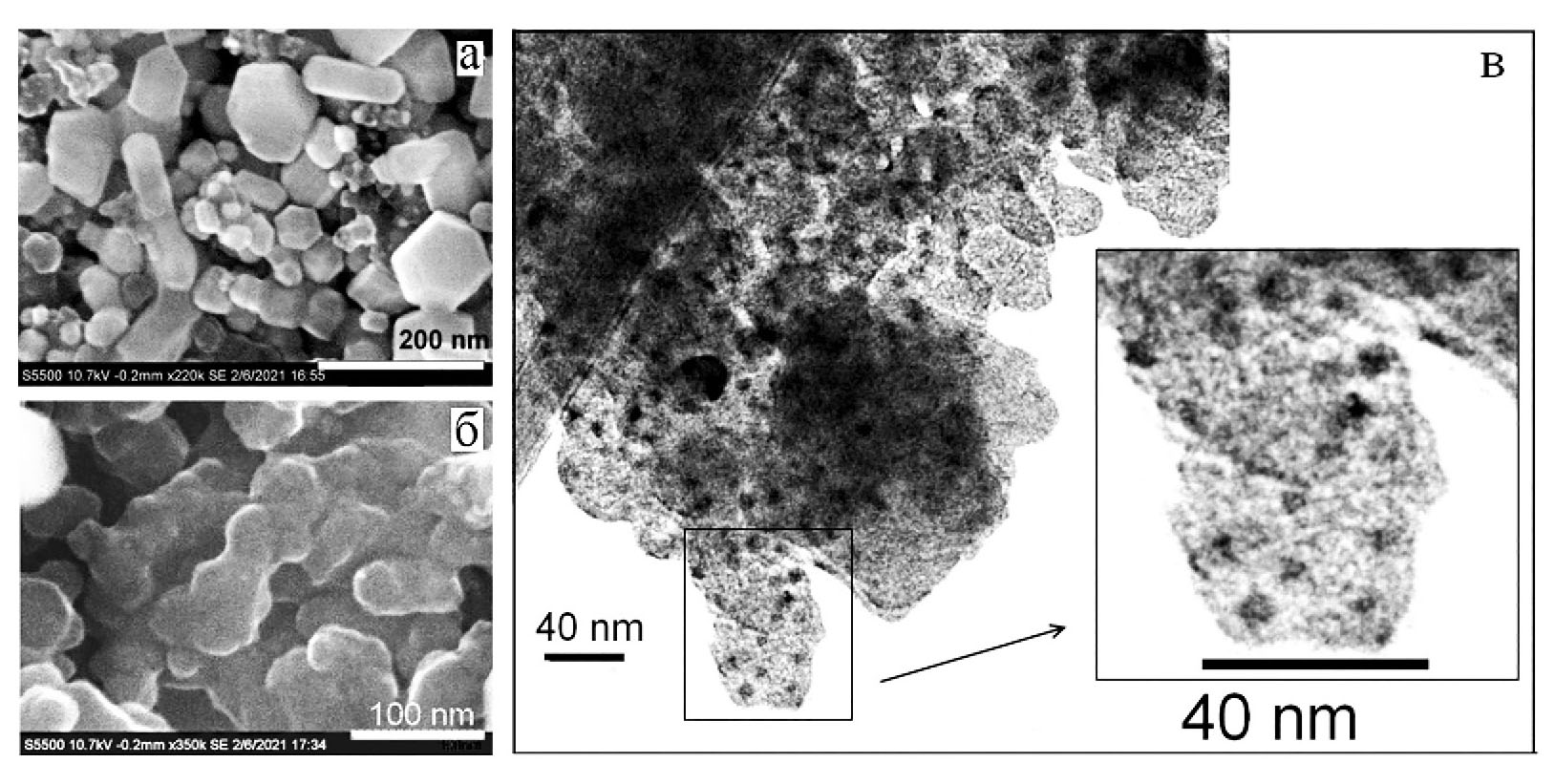 По данным электронной сканирующей микроскопии (ЭСМ) образец 1 cодержит нанокристаллы размерами 20–100 нм (рис. 1, а), в других местах образца 1 на ЭСМ просматриваются расплывчатые удлиненные блочные структуры шириной около 50 нм (рис. 1, б). По показаниям просвечивающей электронной микроскопии (ПЭМ) в менее плотных, т. е. лучше просвечиваемых электронным лучом, блочных структурах рассеяны более плотные наночастицы размерами 3–10 нм (рис. 1, в).