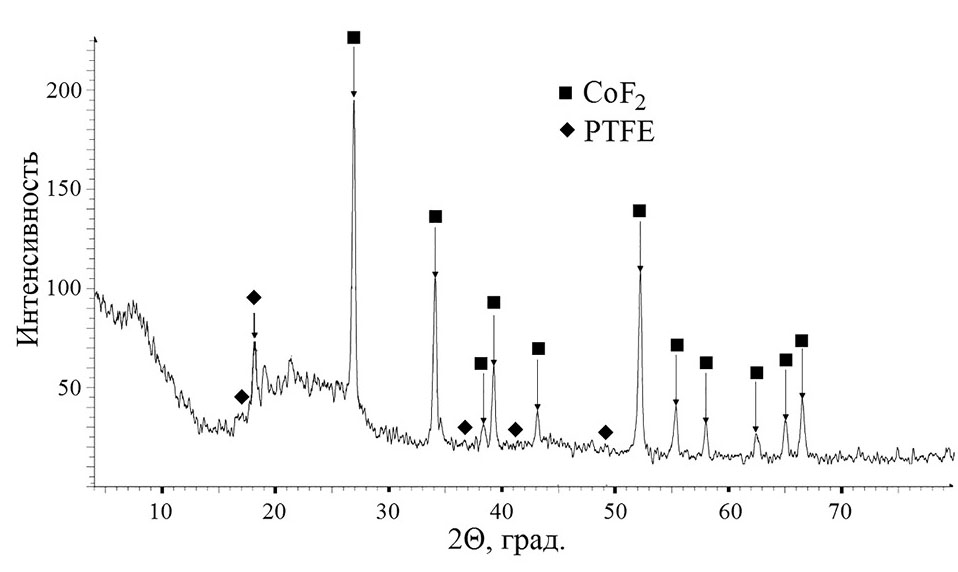 Основная часть спектра РФА образца 1 отвечает спектру CoF2 (рис. 2). Кроме этого, по результатам РФА в образце 1 содержится небольшое количество ПТФЭ.