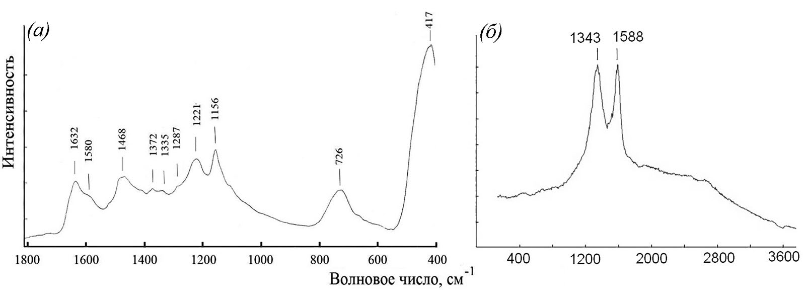Рис. 8. ИК (а) и КР (б) спектры образца 2
