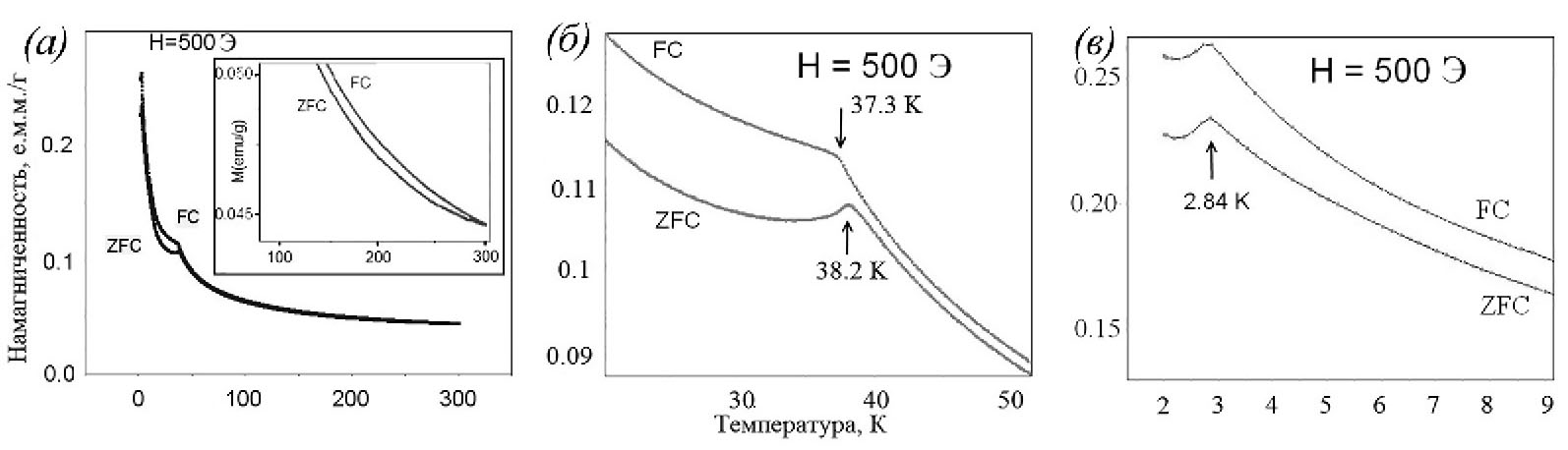 Рис. 10. Температурная зависимость намагниченности образца 2 (а), б, в – увеличенные участки зависимости а. Показана увеличенная вершина пика (в)