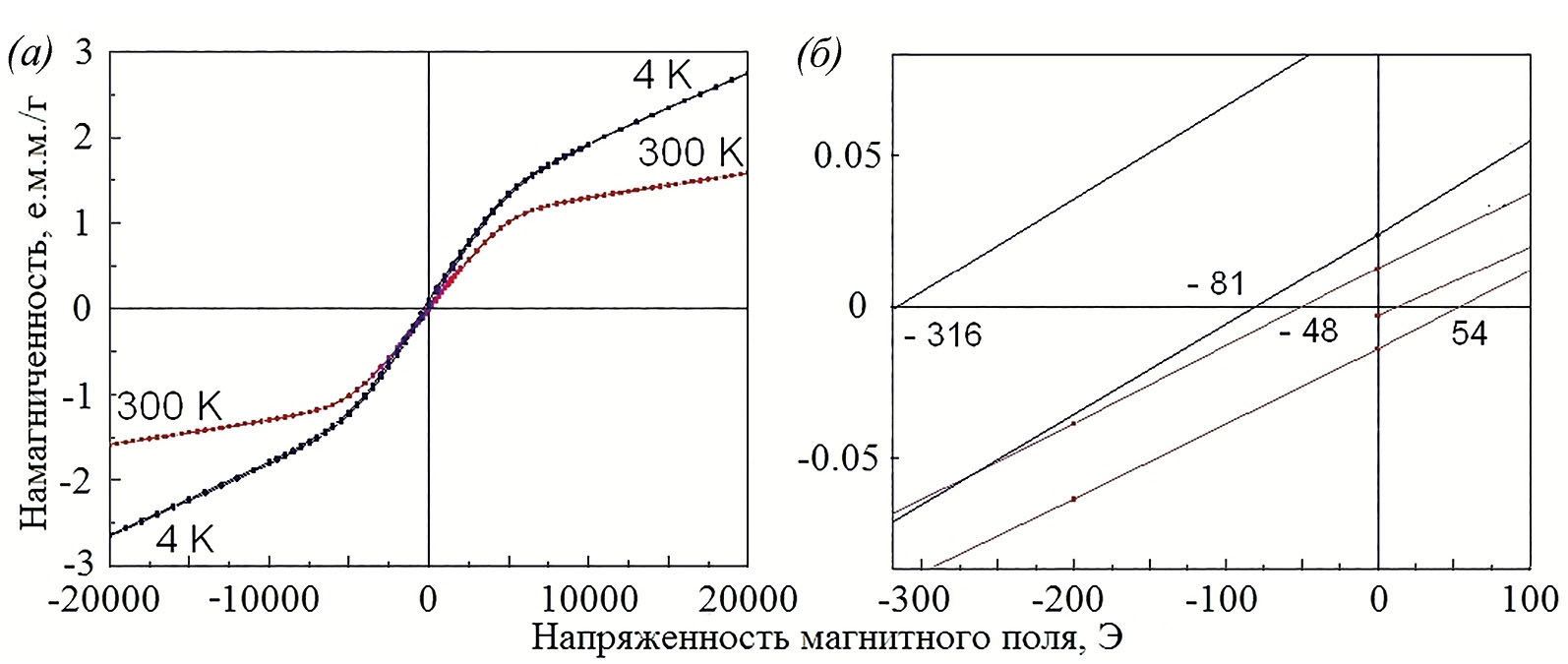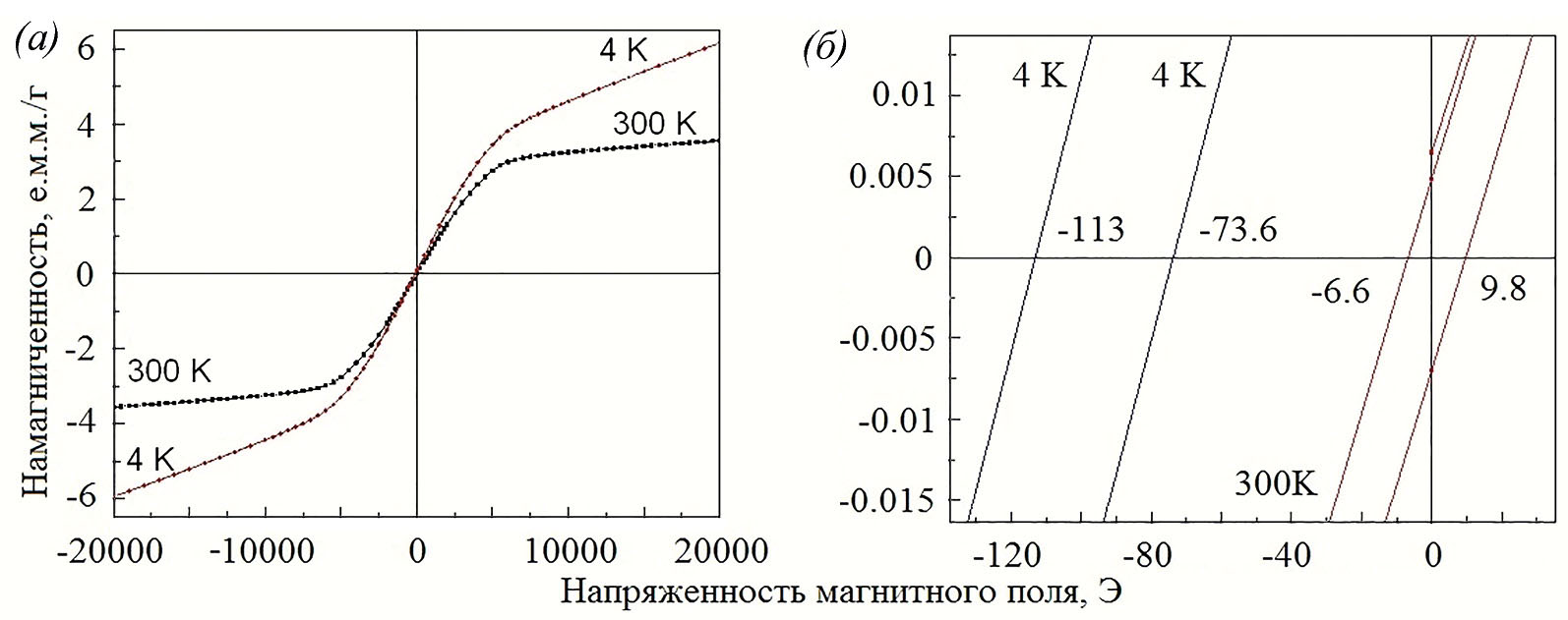 Магнитные свойства образца 2. Так же, как и в образце 1, на полевых зависимостях намагниченности образца 2, записанных при T = 4 K, наблюдается петля магнитного гистерезиса (рис. 9, а, б), которая сдвинута в область отрицательных магнитных полей (Hc– = −316 Э, Hc+ = −81 Э, величина гистерезиса ∆H = 245 Э). Сдвиг петли гистерезиса объясняется смещающим магнитным взаимодействием между АФМ ядром и ФМ оболочкой нанокристаллов Co3O4.