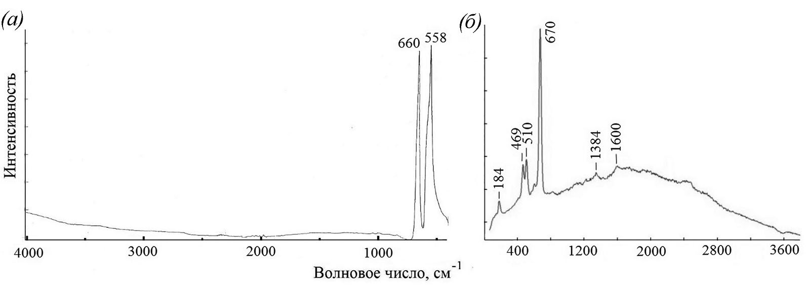 ИК спектр образца 2 отвечает спектру Co3O4 – полосы при 659 см−1 и 558 см−1 [19] (рис. 8, а) и подтверждает данные РФА. РФЭС данные указывают, что в поверхностном слое образца 2 кроме Co3O4 присутствует углерод (см. таблицу). Вероятно, он локализуется на поверхности нанокристаллов в виде пленки, имеющей нанометровую толщину, поэтому ИК спектрометру не хватает чувствительности для ее обнаружения. Метод же РФЭС обнаруживает углерод, так как известная глубина РФЭС анализа менее 10 нм.