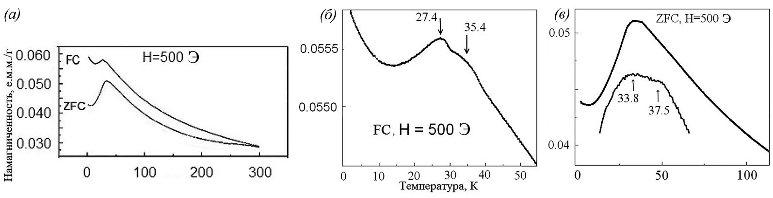 Так же, как и в образце 1, в образце 2 наблюдается температурный гистерезис зависимостей FC и ZFC (рис. 10, а), указывающий на формирование во внешнем магнитном поле магнитного метастабильного состояния. Конкретный механизм возникновения этого состояния требует дополнительных экспериментов.