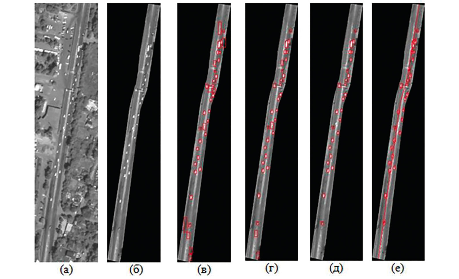 Рис. 1. Базовые стадии работы метода детектирования и классификации ТС: а – участок спутникового снимка, включающий в себя изображение перегона; б – изображение перегона в рамках рассматриваемого участка, полученное программной реализацией алгоритма сокращения области поиска; в – множество гипотез, полученных модифицированным алгоритмом селективного поиска; г – набор гипотез, оставшихся в результате выполнения фильтрации по низкочастотной информации и по размерам; д – множество детектированных ТС, для которых была выполнена классификация; е – ТС с определенным направлением движения, полученным исходя из относительной позиции на дорожном полотне
