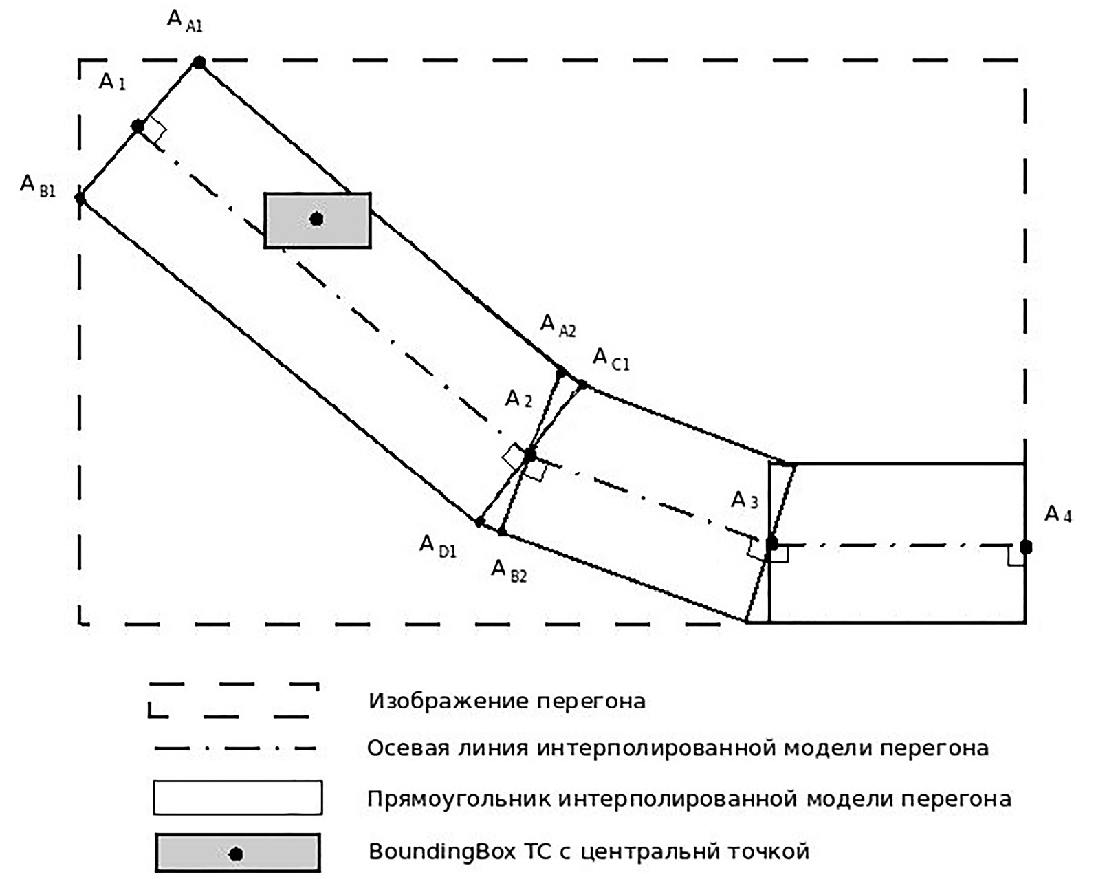 Производится определение, на какой половине дороги находится центральная точка минимального ограничивающего прямоугольника (BoundingBox) обнаруженного автомобиля. То есть при рассмотрении интерполированной цифровой модели перегона устанавливают, с какой стороны относительно ломаной цепочки отрезков перегона находится центральная точка ТС.