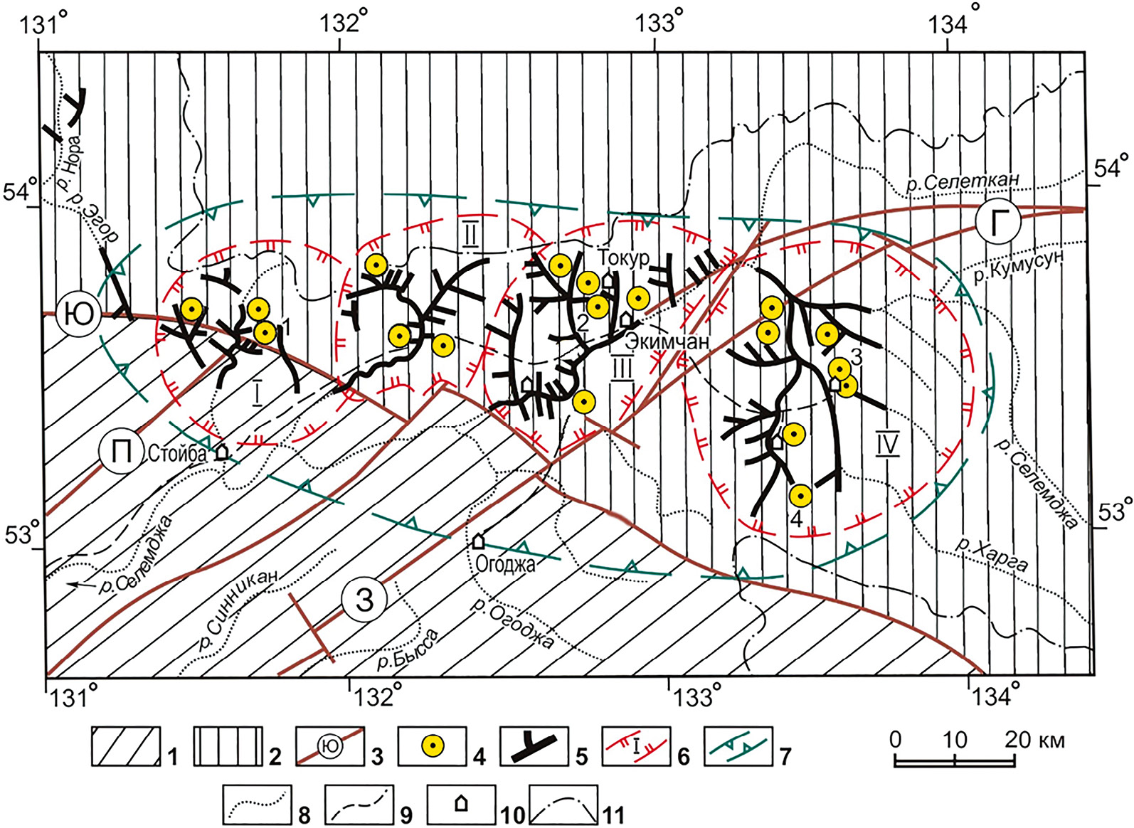 1 – Амурский геоблок, 2 – Монголо-Охотский геоблок, 3 – региональные разломы (Ю – Южно-Тукурингрский, П – Призейский, Г – Галамский, З – Западно-Туранский), 4 – золоторудные объекты: а – месторождения (1 – Осеннее, 2 – Кварцитовое, 3 – Маломыр, 4 – Поисковое, 5 – Ворошиловское, 6 – Сагур, 7 – Разведочное, 8 – Иннокентьевское, 9 – Токур, 10 – Тарнах, 11 – Ясное, 12 – Ингагли, 13 – Унгличикан, 14 – Албын, 15 – Харгинское, 16 – Афанасьевское, 17 – Эльгинское, 18 – Казанское), б – проявления, 5 – россыпи золота, 6 – границы рудно-россыпных узлов (I–Маломырский, II – Верхнестойбинский, III – Токурский, IV–Харгинский), 7 – контур Токурского золоторудного центра, 8 – водотоки, 9 – автодороги, 10 – населенные пункты, 11 – административная граница между Амурской областью и Хабаровским краем