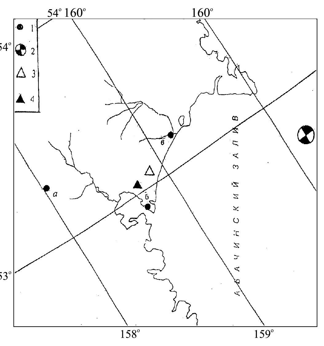 Рис. 1. Карта-схема района геомеханических исследований на Камчатке. 1 – геомеханические датчики, созданные: а – в долине р. Тополовая, б – на утесе Авачинской бухты, в – в устье р. Налычева; 2 – эпицентр землетрясения в Авачинском заливе 02.03.1992 г. с М = 7,1; 3 – геомеханический датчик на горе Толстый Мыс; 4 – геомеханический датчик на сопке Петровская