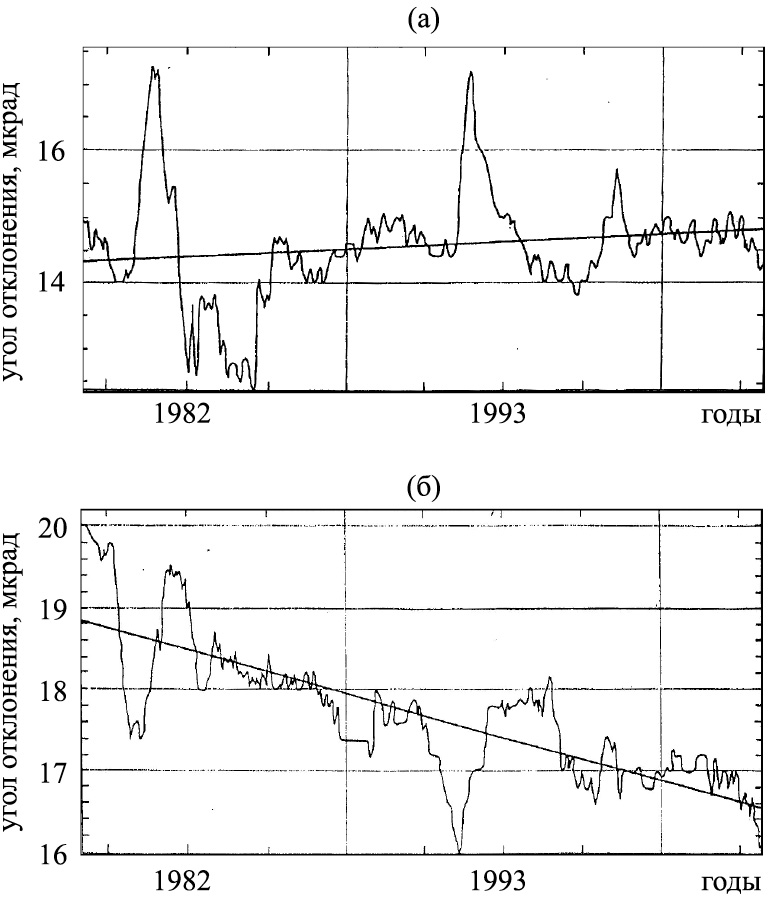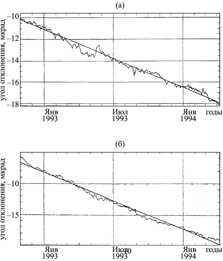 Среднеквадратичные отклонения рядов от линейных трендов не превышают ошибки измерения. А это значит, что колебания градиентов смещения на рис. 2 и 3 вызваны грунтовыми водами.