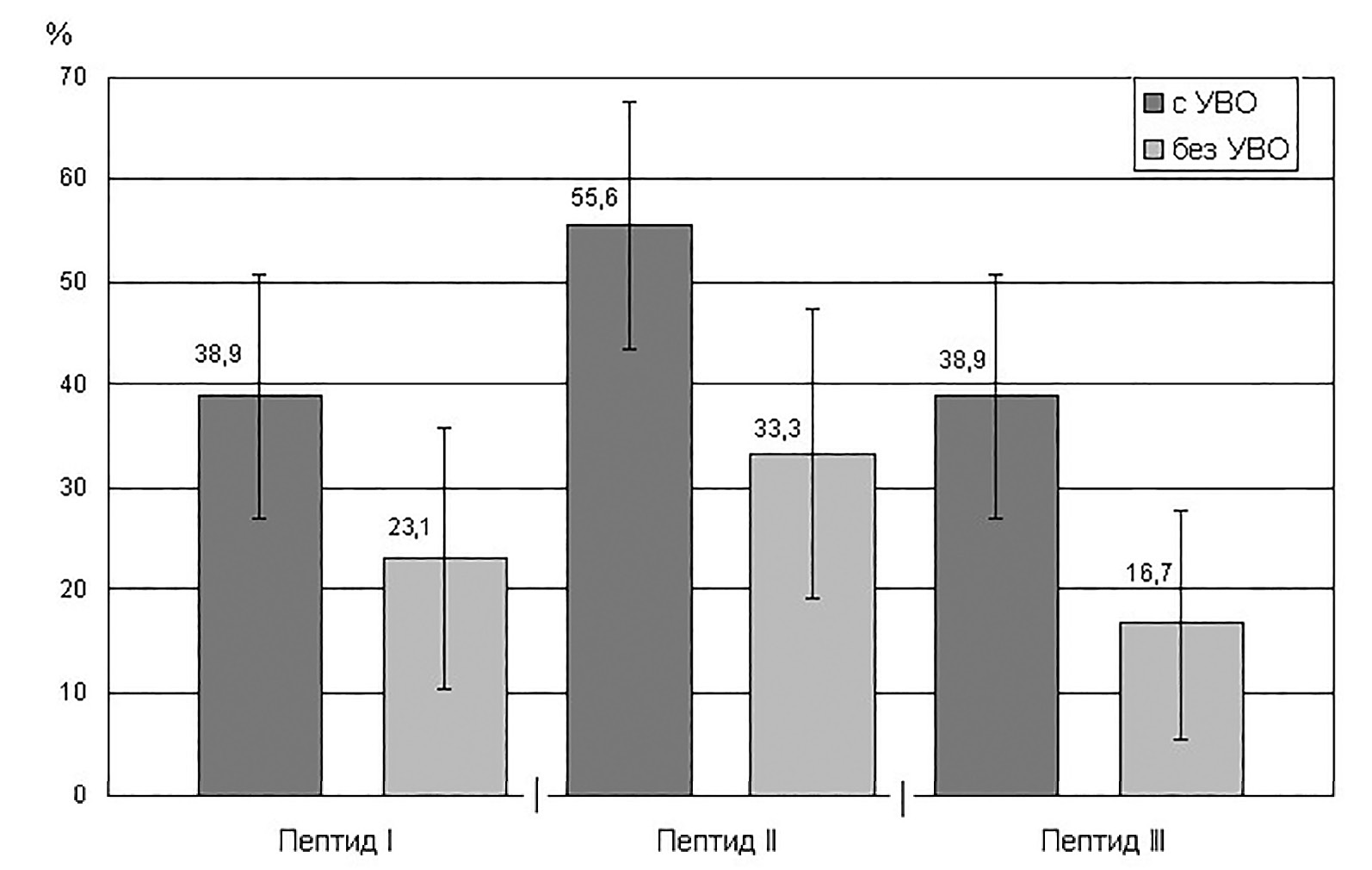 Среди проанализированных 63 образцов (от 63 пациентов) антитела к пептидам были обнаружены в 35 пробах, что соответствует частоте обнаружения 55,6 ± 6,3%. На рис. 1 представлена частота выявления антител к трем пептидам.