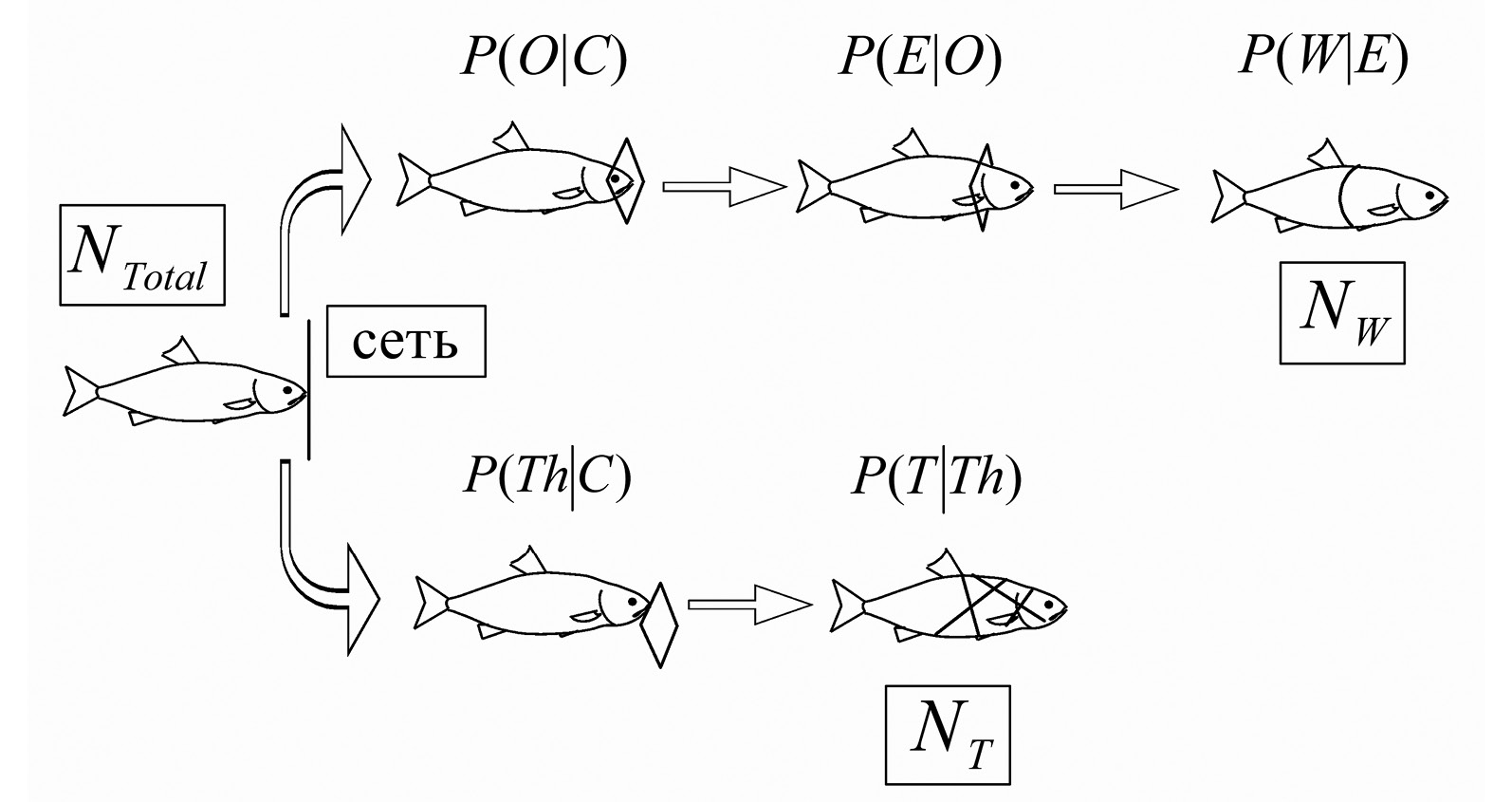 Рис. 1. Различные этапы взаимодействия рыбы с жаберной сетью. NTotal – общее количество рыбы, прикоснувшейся к сети, NW – количество объячеившейся рыбы, NT – количество запутавшейся рыбы. Вероятность: P(O|C) – попадания рыбы в ячею при касании, P(Th|C) – попадания ртом на нить при касании, P(E|O) – захода в ячею, P(W|E) – удержания в сети через объячеивание, P(T|Th) – удержания в сети через запутывание. Вертикальная черта обозначает условную вероятность