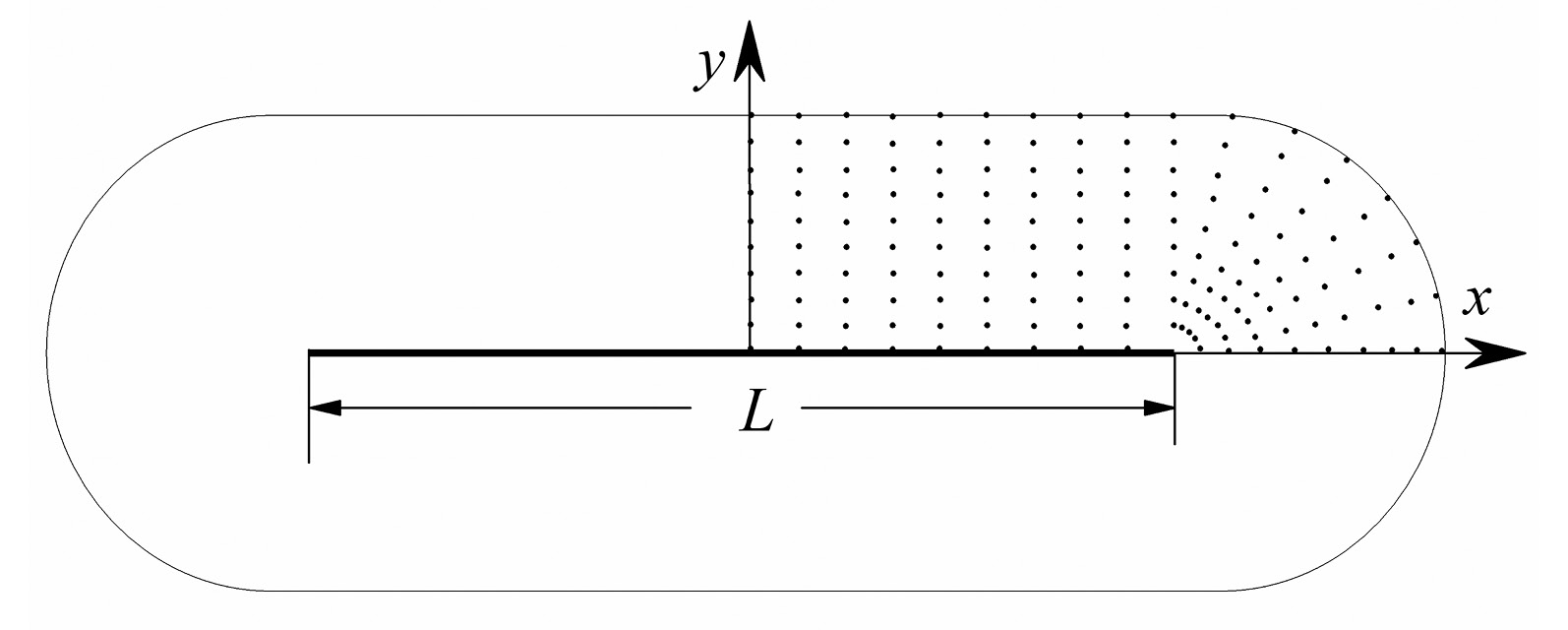 Рис. 2. Схема зоны облова жаберной сети; каждая точка в верхней четверти зоны является узлом, для которого рассчитывается вероятность по формуле (13), L – длина сети
