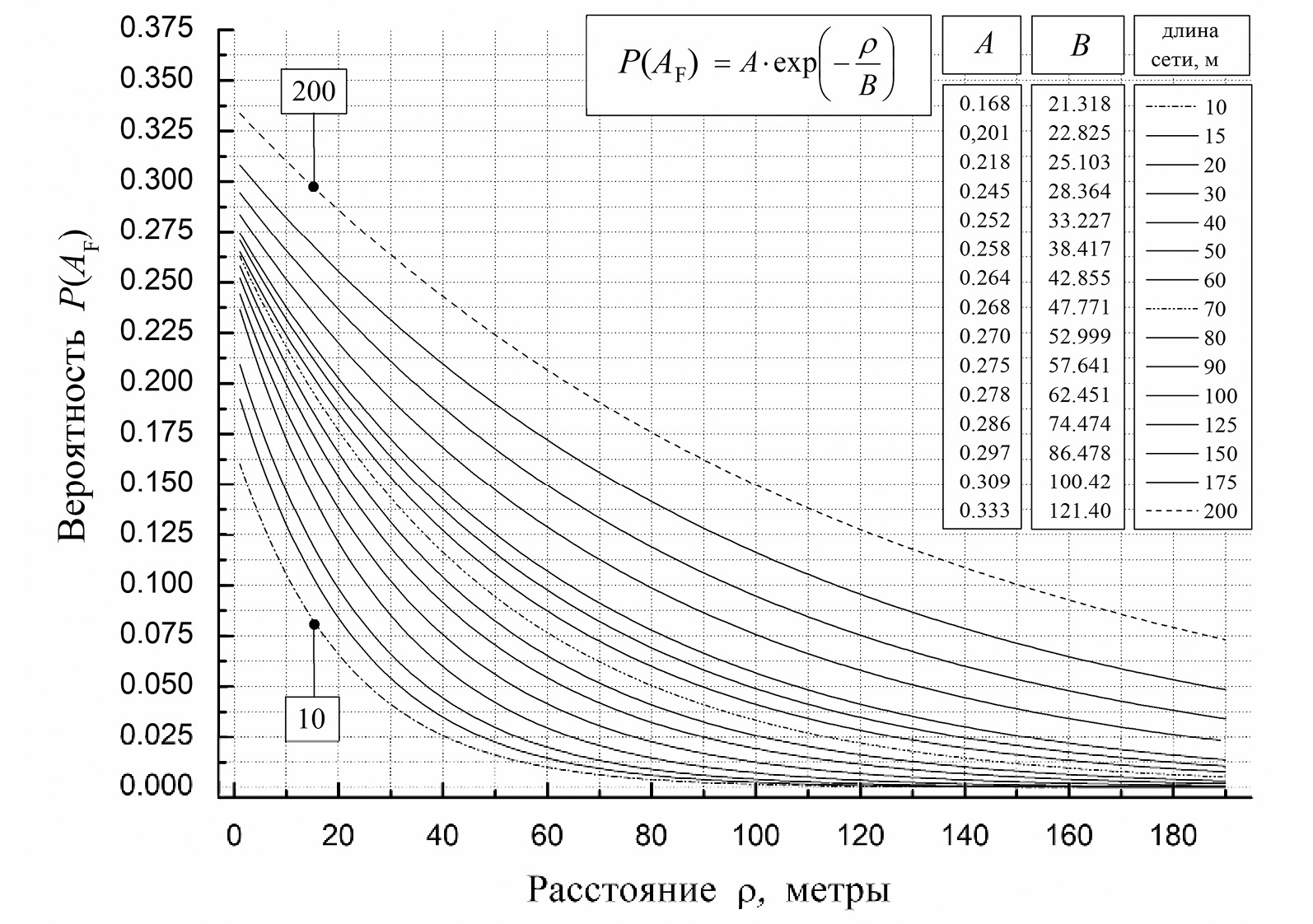 В связи с тем, что расчеты вероятности P(AF) весьма трудоемкие, построена номограмма для ее оценки при различных значениях ρ и длины сети L (рис. 3). Распределение P(AF) хорошо описывается экспоненциальной функцией вида (R = 0,99), где А и В – опытно оцененные параметры; P(AF) можно также вычислить, подставляя в эту функцию величину ρ и величины А и В для нужной длины сети.