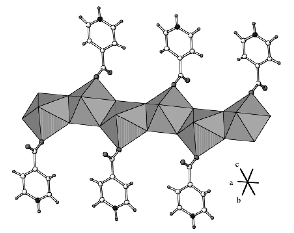 Соединение [UO2F2 (C5H5NCO2)] образует одномерную структуру, содержащую бесконечные цепи, образованные из реберно-связанных пентагонально-бипирамидальных полиэдров UO5F2, простирающихся вдоль направления [100] и разделенных изоникотинатными анионами (рис. 1) [2]. Атом U в бесконечной цепи координирован аксиально двумя атомами O и экваториально четырьмя мостиковыми атомами F и карбоксильным атомом O изоникотинатного лиганда. В рамках связанности структура [UO2F2(C5H5NCO2)] может быть описана как [UO2/1F4/2O1/1].