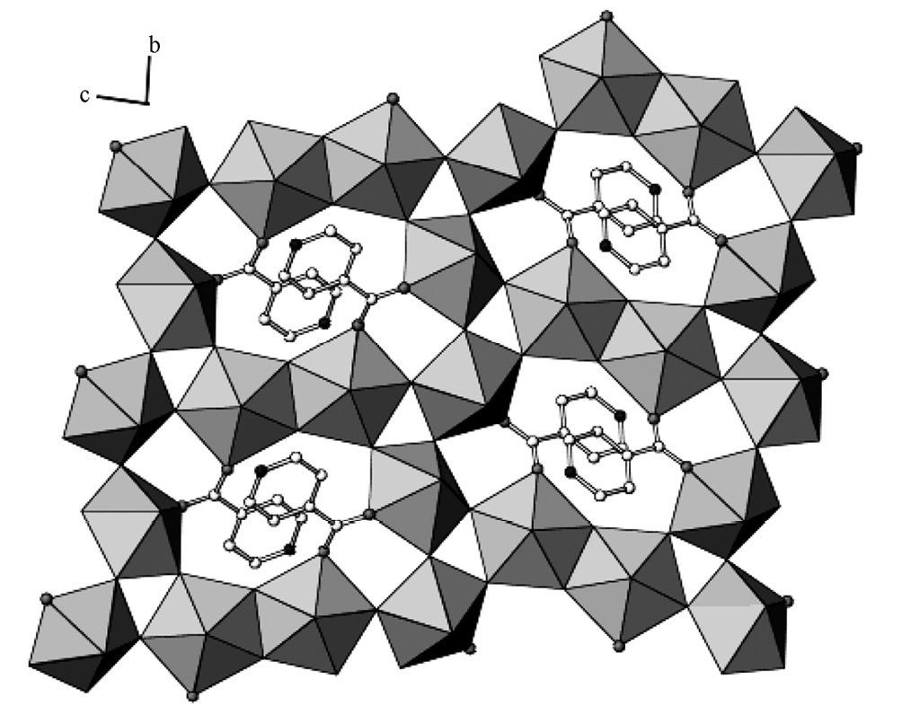 Группы пиридина изоникотинатных лигандов расположены выше и ниже образованных в слое отверстий. В межслоевой области имеются каналы примерного размера 3,7 × 3,5 Å, простирающиеся вдоль направления [010] и окруженные пентагональными бипирамидами атомов U и изоникотинатными группами. Молекулы кристаллизационной воды занимают каналы и образуют водородные связи N–H···O и O–H···O(1), равные 2,718 и 2,817 Å соответственно.