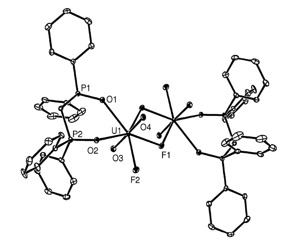В работе [15] описан синтез и исследование кристаллической структуры трех разнолигандных комплексных соединений уранила с фосфиноксидными лигандами, содержащими различные органические группы: [{UO2(µ-F)(TPPO)3}2][BF4]2·nC6H14, [{UO2(µ-F)(TBPO)3}2][BF4]2 и [UO2(µ-F)(F)(DPPMO2)]2·2MeOH (TPPO – трифенилфосфин оксид, TBPO – три-n-бутилфосфиноксид, DPPMO2 – бис(дифенилфосфиноксид) метана).