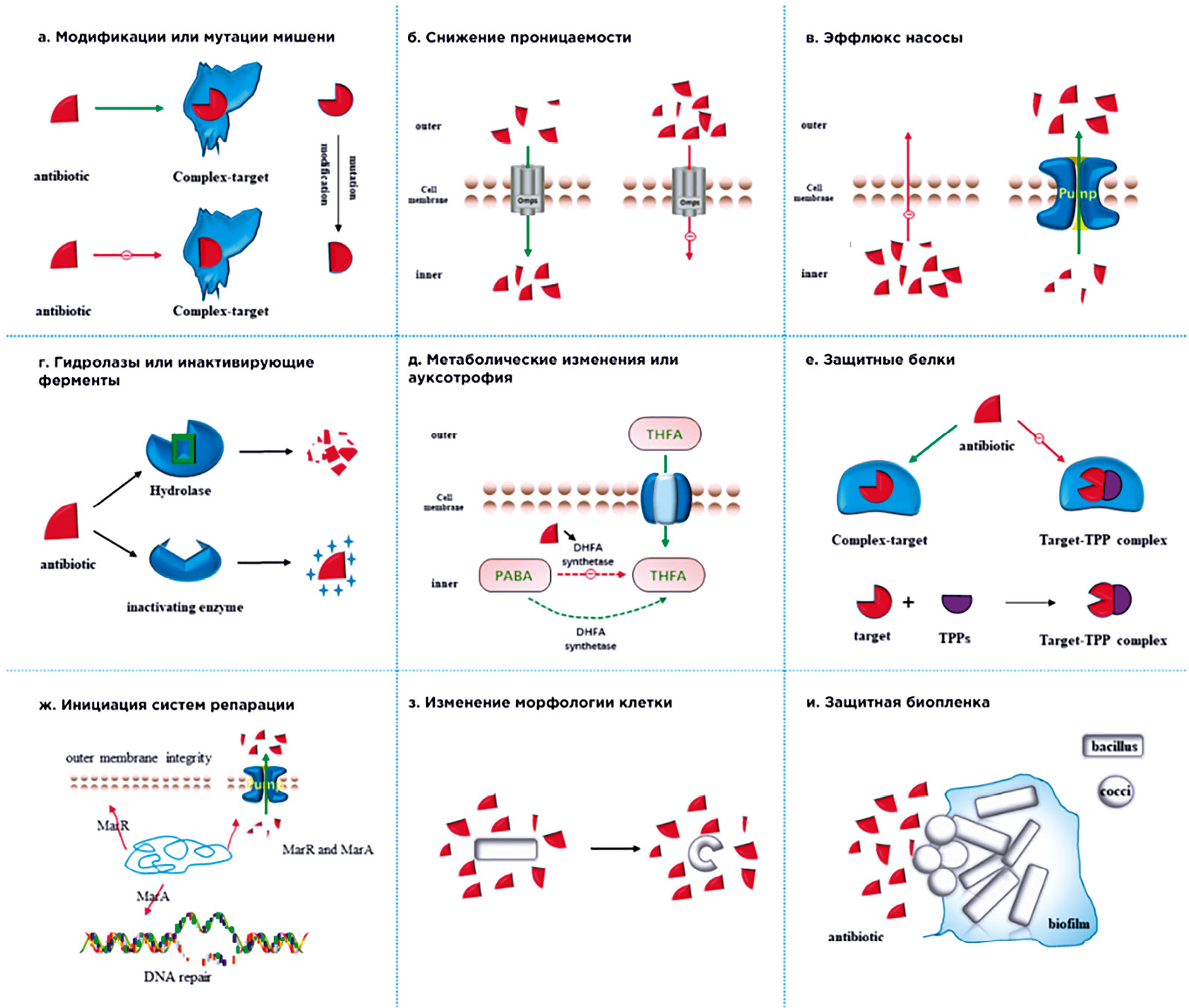 Рис. 1. Основные механизмы устойчивости бактерий к антибиотикам [24]