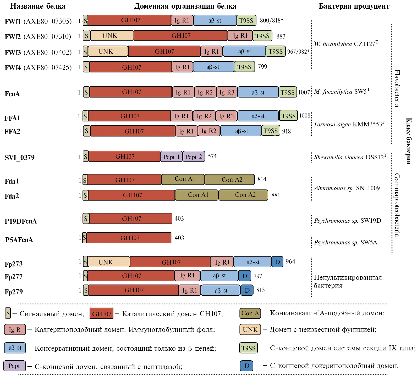 Рис. 2. Доменная организация полипептидных цепей FWf1‒FWf4 и охарактеризованных фуканаз семейства GH107. Длины аминокислотных последовательностей фуканаз указаны справа от схематического изображения их доменной организации. Для FWf1 и FWf3 они приведены как для ситуаций с отсутствующими сигнальными последовательностями (GenBank: ANW96097.1 (FWf1) и ANW96115.1 (FWf3)), так и для тех (*), в которых последние присутствуют (GenBank: WP_083194609.1 и WP_083194615.1)