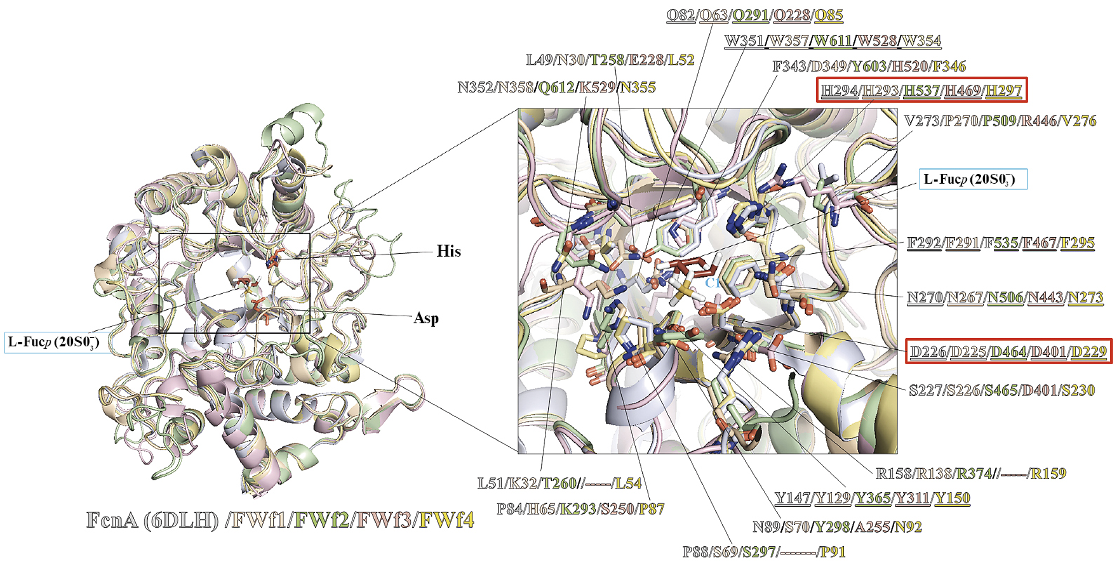 Структурное выравнивание пространственных моделей фуканаз FWf1‒FWf4 и фуканазы FcnA (шифр PDB: 6DLH) показало, что состав и расположение аминокислотных остатков активного центра FWf4 были практически идентичными таковым в активном центре фуканазы FcnA. Помимо высококонсервативных остатков Asp и His в активных центрах FWf1, FWf2 и FWf3 было отмечено большое количество вариабельных аминокислотных остатков (рис. 5).
