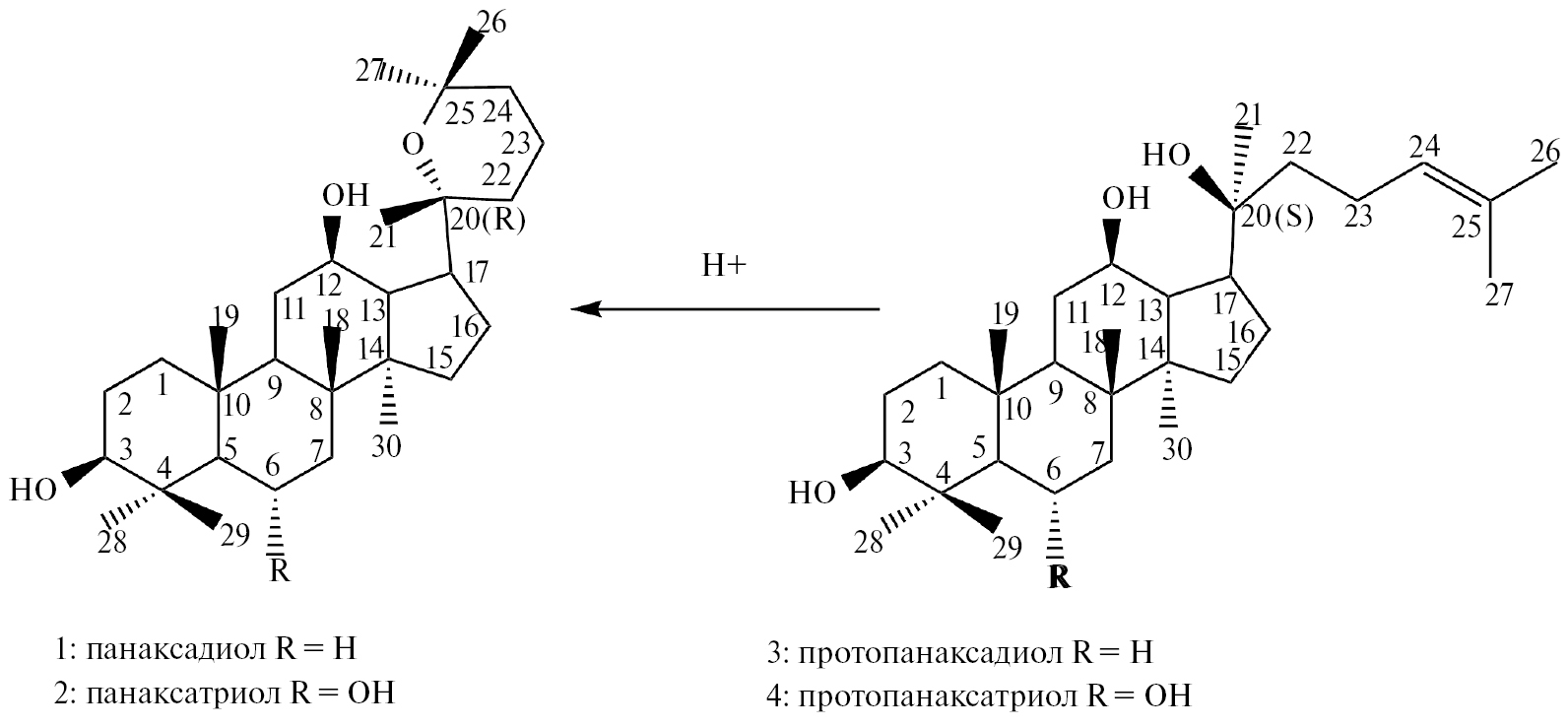 Использование ферментативного гидролиза для расщепления гликозидов женьшеня позволило выделить сапогенины в нативном виде [17–19]. Нативные сапогенины стали называть протопанаксадиол (3) и протопанаксатриол (4), добавляя приставку «прото-» к уже существующим названиям панаксадиол и панаксатриол, подчеркивая этим первоначальность их и одновременно структурное родство с полученными ранее артефактными агликонами [11] (см. рисунок).