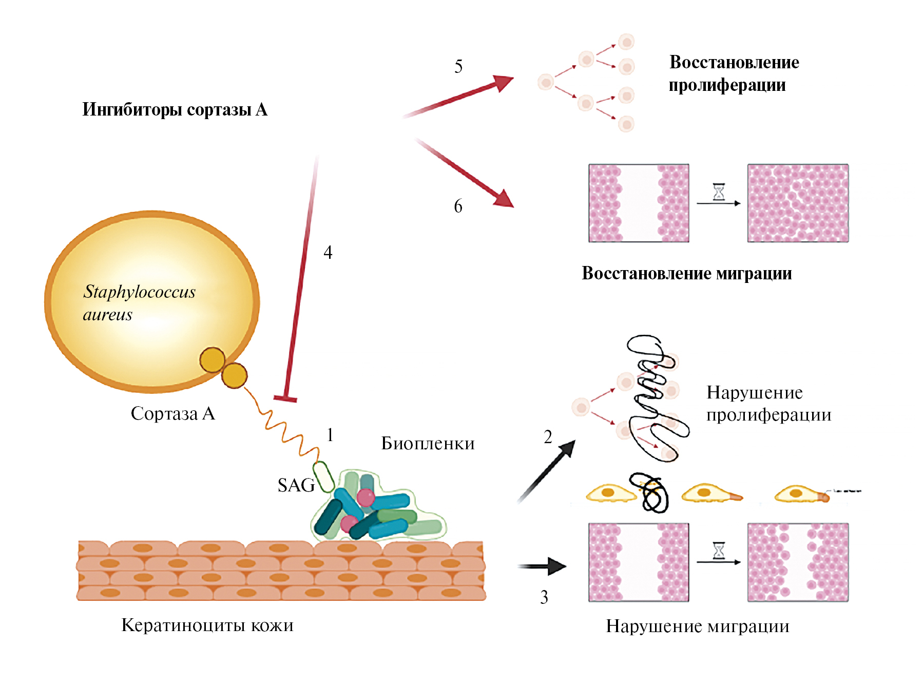 Рис. 3. Схема действия антибиотиков, мишенью которых является сортаза А. Фермент сортаза А – один из ключевых при образовании биопленок грамположительными бактериями Staphylococcus aureus (1), что при инфицировании клеток кожи приводит к торможению их пролиферации (2) и миграции (3). Ингибирование активности сортазы А (4) обеспечивает восстановление уровня пролиферации кератиноцитов (5) и их миграции (6)