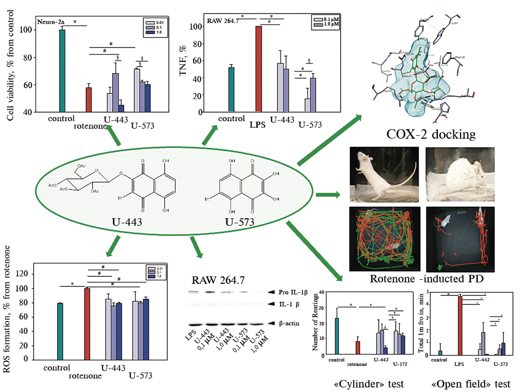 Рис. 5. Схема действия производных 1,4-NQs U-443 и U-573, защищающих нейрональные клетки Neuro-2a и макрофагальные клетки RAW 264.7 от нейротоксического действия ротенона, оказывающих противовоспалительный эффект и восстанавливающих когнитивное поведение у животных с индуцированной ранней стадией БП