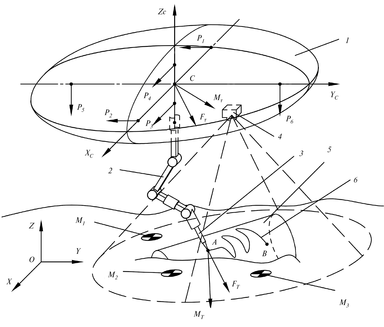 На четвертом этапе предлагаемого подхода, зная текущее расположение точек C и A (с использованием показаний СТЗ) в абсолютной СК, а также исходное расположение ММ в связанной СК CXcYcZc, осуществляется перевод РИ ММ из его исходного положения в точку A рабочей траектории (см. рис. 1). Для этого на входы подсистемы управления электроприводами ММ исполнительного уровня ИИУС подаются соответствующие управляющие сигналы, обеспечивая плавный перевод РИ ММ из исходного положения до касания ОР в точке A. Во время этого перевода, непрерывно в реальном масштабе времени решая обратную задачу динамики для ММ по известному рекуррентному алгоритму [9] с учетом ранее идентифицированных присоединенных масс и моментов инерции жидкости, определяются плавно изменяющиеся силовое и моментное воздействия на АНПА со стороны перемещающегося в вязкой среде ММ. Эти воздействия автоматически компенсируются подсистемой стабилизации ИИУС за счет плавного изменениями тяг соответствующих движителей Pi·(i = 1,6—) АНПА.