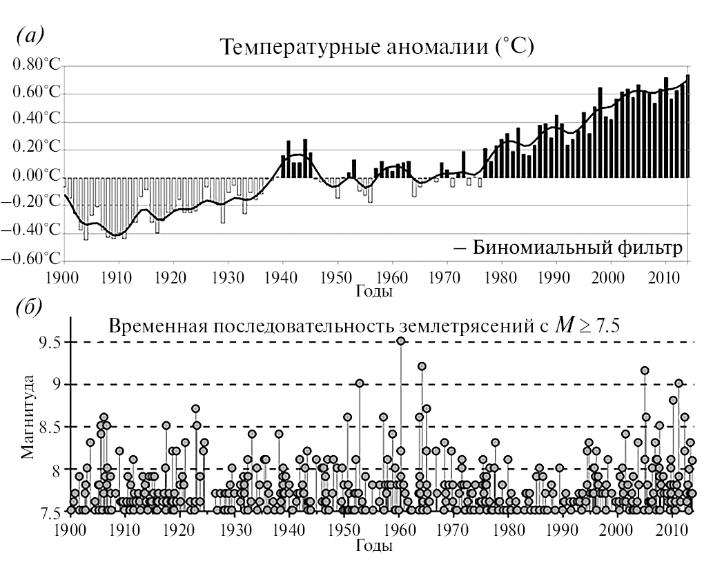 Рис. 4. Сопоставление графиков: a – изменения средней температуры в Арктике на протяжении XX и начала XXI в. [15], модифицировано; б – временной последовательности сильнейших землетрясений согласно [16], модифицировано.
