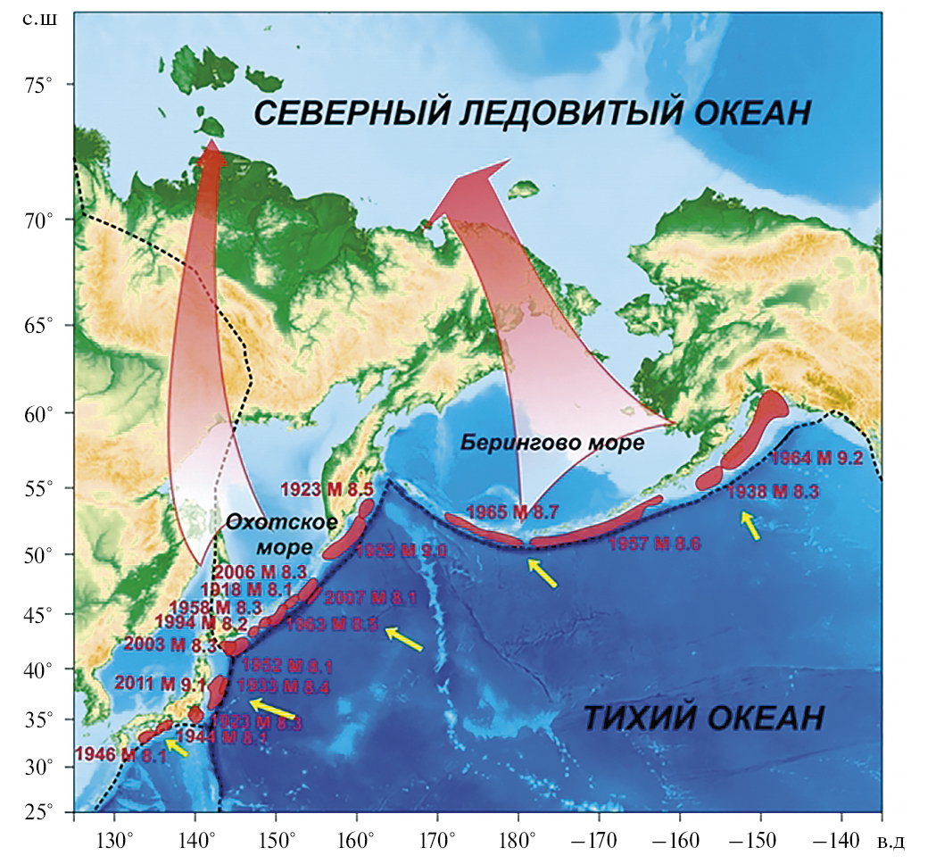 Рис. 5. Распространение деформационных волн в Арктический регион, вызванных сильнейшими землетрясениями в Алеутской и Курило-Камчатской зонах субдукции.