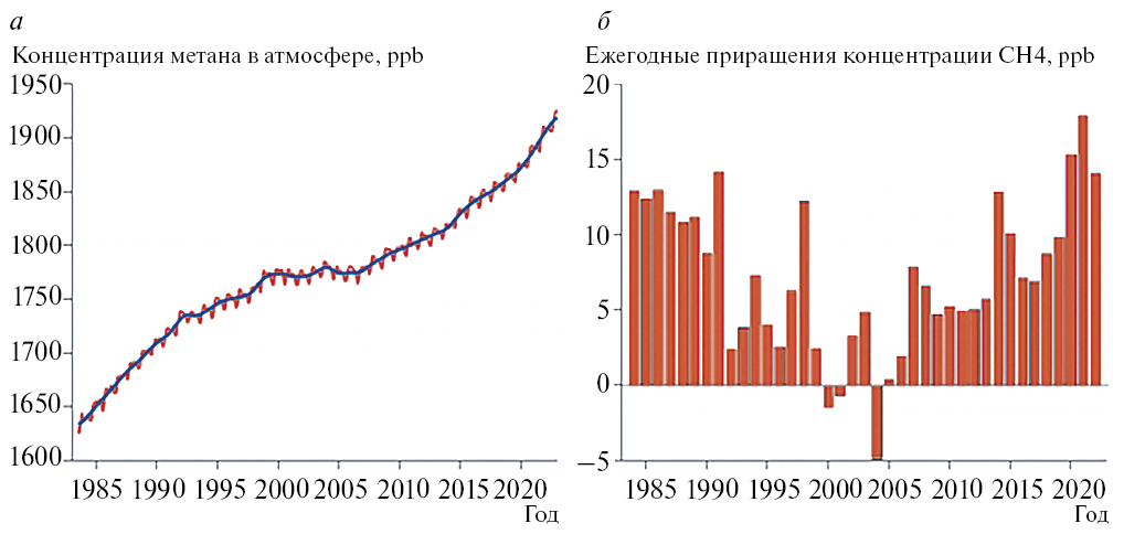 Рис. 7. Средняя концентрация метана в атмосфере: а – графики, демонстрирующие глобально осредненное среднемесячное значение метана в атмосфере [30]; б – график годовых приращений атмосферного CH4 на основе глобально усредненных данных о морской поверхности [31].