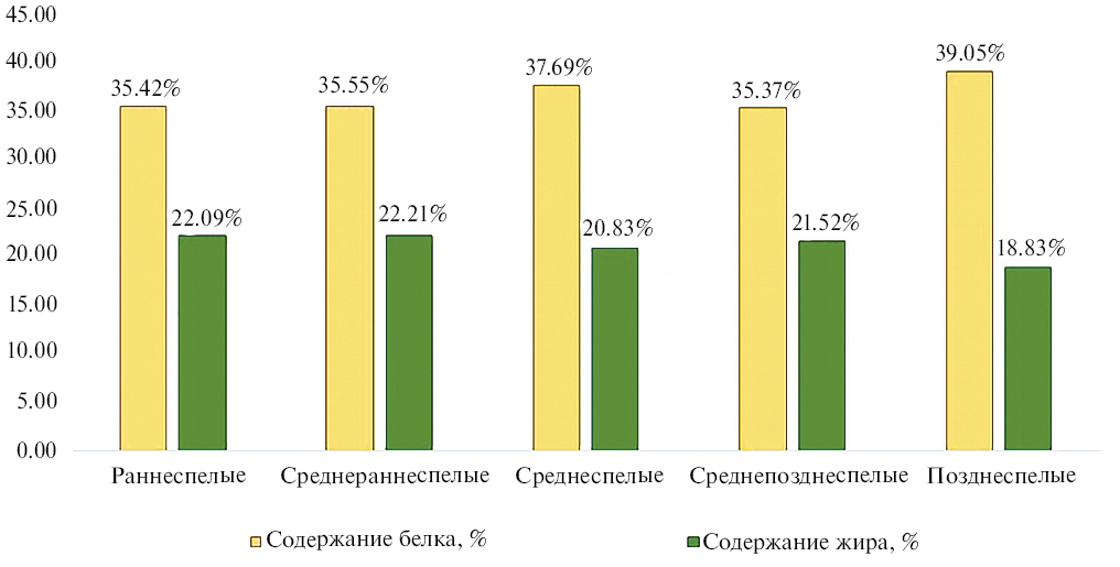 Различие накопления белка и жира в семенах сои разных групп спелости можно трактовать, исходя из особенностей влияния агроклиматических условий на растения в период их роста и развития [11]. Накопление белка в семенах сои начинается на 10–15 дней раньше, чем накопление жира [1]. У сортов раннеспелой группы период налива семян значительно укорочен, и ткани семядолей, как правило, успевают накопить значительное количество белка, но не полностью реализовать свой масличный потенциал. Однако за период проведения исследований образцы ранней группы спелости показали низкий процент накопления белка, но при этом высокий процент накопления масла в семенах сои. Сорта среднеранней и средней групп спелости вступают в фазу формирования бобов – налива семян и налива семян – созревания в условиях с меньшими температурами и более обильным увлажнением, поэтому содержание масла остается в среднем диапазоне, пропорционально этому содержание белка в семенах несколько сокращается. У образцов среднепоздней и поздней групп спелости идущие на спад температуры сентября–октября снижают накопление масла, при этом содержание белка увеличивается.