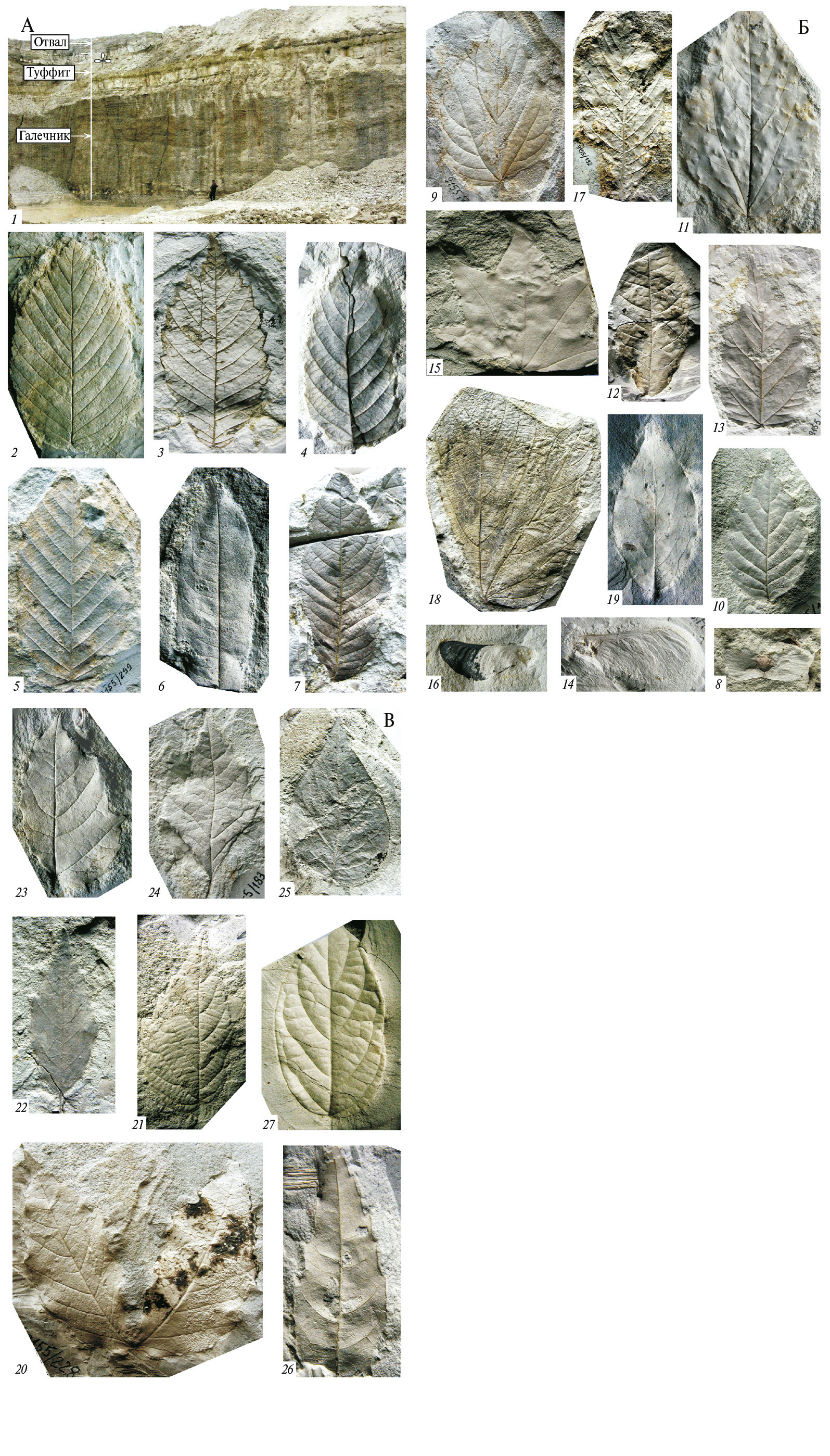 Рис. 2. Листья и плоды из местонахождения усть-суйфунской флоры, т. 9155. А: 1 – фрагмент юго-восточной стенки карьера Дорожный, т. 9155; 2 – Ulmus suifunensis Klimova, обр. 9155/300; 3 – Ulmus drepanodonta Grub., обр. 9155/343; 4 – Alnus schmalhausenii Grub., обр. 9155/124; 5 – Carpinus macrophylla Pavlyutkin, обр. 9155/299; 6 – Pterocarya primorica Pavlyutkin, обр. 9155/123; 7 – Carya sp., обр. 9155/310. Б: 8 – Pterocarya sp. (fructus), обр. 9155/103; 9 – Celtis inequilateralis Pavlyutkin, обр. 9155/269; 10 – Zelkova zelkovifolia (Ung.) Bůžek et Kotlaba, обр. 9155/177; 11 – Populus zaisanica Iljinskaja, обр. 9155/80; 12 – Phellodendron grandifolium Iljinskaja, обр. 9155/358; 13 – Acer nezhinoense Pavlyutkin, обр. 9155/357; 14 – Acer sp.-1 (samara), обр. 9155/137; 15 – Acer monoides Shap. (folium), обр. 9155/107; 16 – Acer sp.-2 (samara), обр. 9155/382; 17 – Aesculus mayus (Nath.) Tanai (foliolum), обр. 9155/192; 18 – Alangium sp., обр. 9155/129; 19 – Cornus miowaltherii Hu et Chaney, обр. 9155/346. В: 20 – Ampelopsis sp. (folium compositum), обр. 9155/228; 21 – Ampelopsis sp. (laterale foliolum), обр. 9155/20а; 22 – Ampelopsis sp. (terminale foliolum), обр. 9155/156; 23 – Parthenocissus sp. (laterale foliolum), обр. 9155/112; 24 – Parthenocissus sp. (terminalre foliolum), обр. 9155/183; 25 – Syringa sp., обр. 9155/170; 26 – Osmanthus sp., обр. 9155/314; 27 – Lonicera krassilovii Pavlyutkin, обр. 9155/360