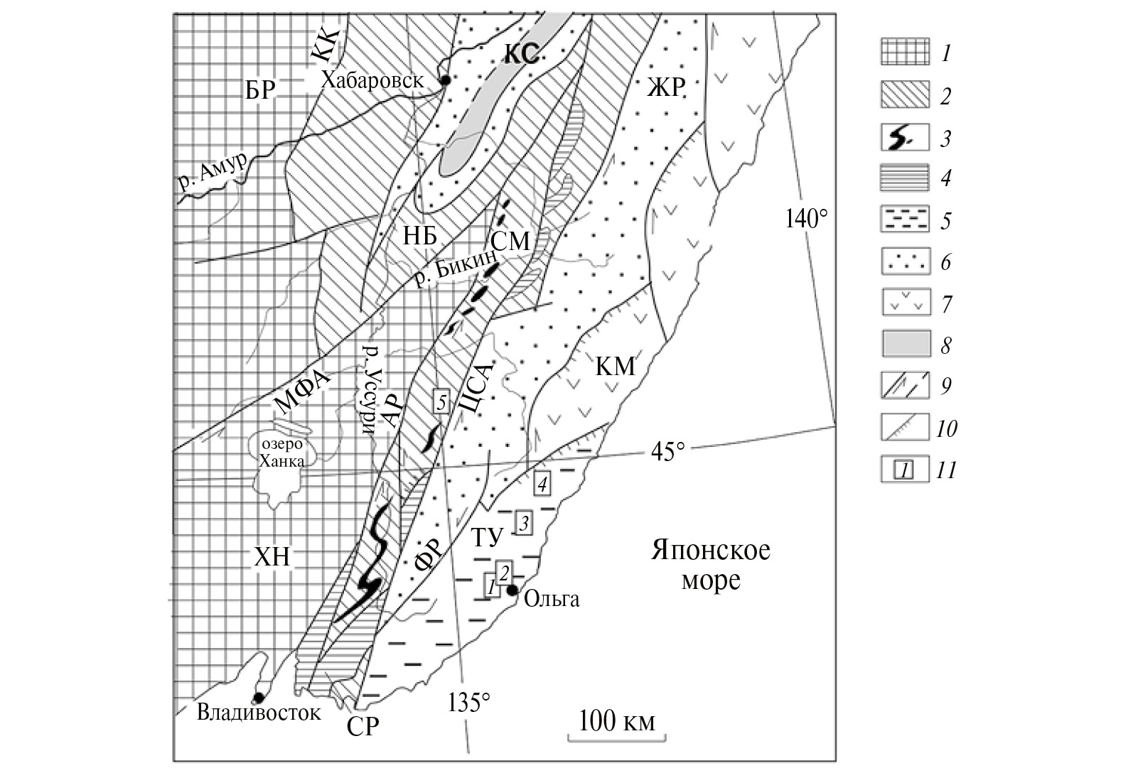 Рис. 1. Положение изученных объектов в Сихотэ-Алине (тектоническая основа по А.И. Ханчуку [13] с небольшими изменениями). 1 – массивы: Ханкайский (ХН), Буреинский (БР); 2 – юрские террейны (фрагменты аккреционных призм): СM – Самаркинский, НБ – Наданьхада-Бикинский; 3 – калиновские габброиды (девон?); 4 – Окраинско-Сергеевский террейн (СР) и его фрагменты, включенные в структуры юрской аккреционной призмы и испытавшие вместе с ними цикл син- и постаккреционных преобразований; 5–8 – раннемеловые террейны-фрагменты: 5 – неокомовской аккреционной призмы (ТУ – Таухинский), 6 – приконтинентального раннемелового спредингового турбидитового бассейна (ЖР – Журавлевско-Амурский), 7 – баррем-альбской островодужной системы (КМ – Кемский), 8 – альбской аккреционной призмы (КС – Киселевско-Маноминский); 9 – левые сдвиги, в том числе: КК – Куканский, АР – Арсеньевский, МФА – Мишань-Фушуньский (Алчанский), ЦСА – Центральный Сихотэ-Алинский, ФР – Фурмановский; 10 – надвиги; 11 – изученные площади с выходами триасовых контактово-метаморфизованных металлоносных осадков: 1 – Широкопаднинская площадь, 2 – Мокрушинская площадь, 3 – Высокогорская площадь, 4 – Садовая площадь, 5 – Горная площадь