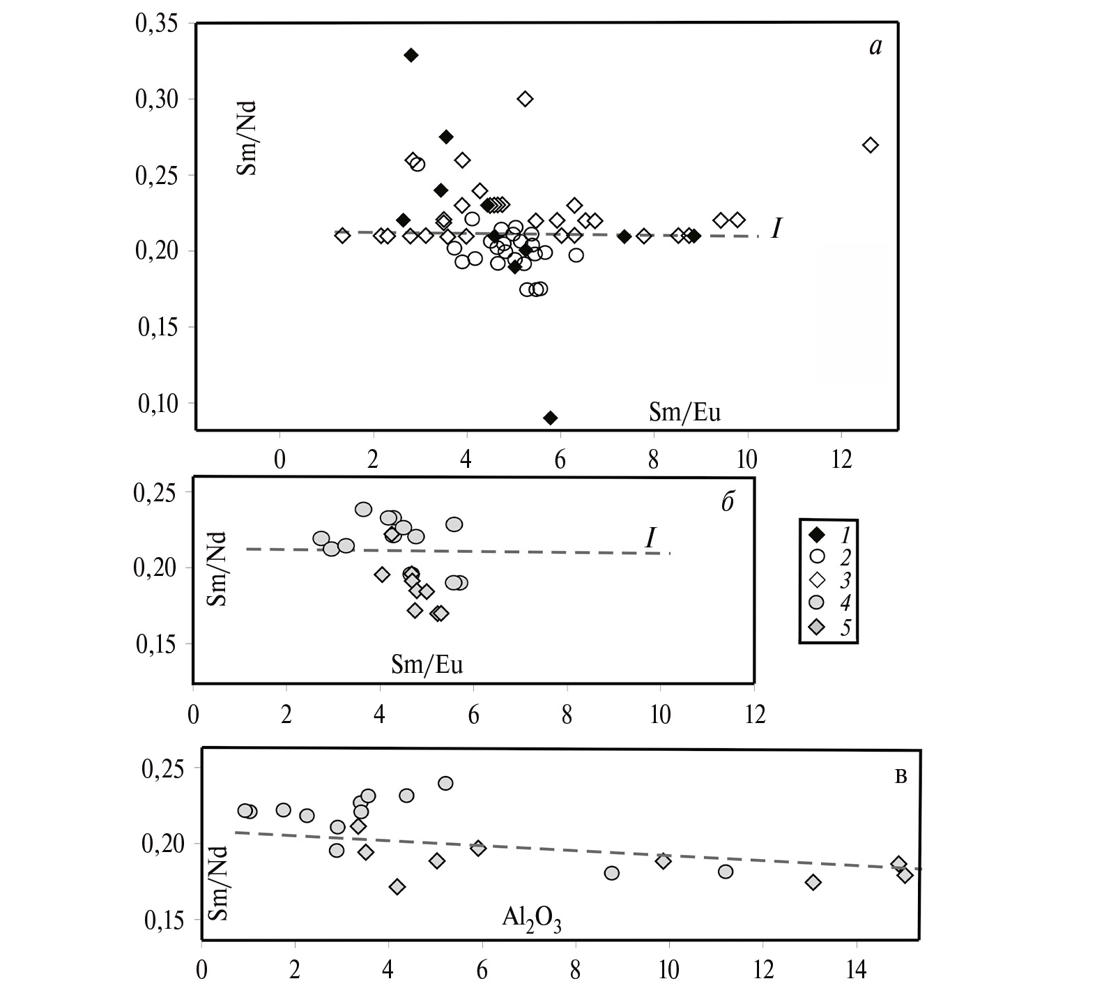 Рис. 4. Положение точек триасовых яшм, юрских кремней и метаморфизованных металлоносных осадков Сихотэ-Алиня на диаграммах Sm/Nd–Sm/Eu и Sm/Nd–Al2O3. а – силикатно-магнетитовые руды (1) и яшмы (2) Широкопаднинской площади Таухинского террейна, марганцево-силикатные породы Горной площади Самаркинского террейна (3); б, в – кремнистые породы: триасовые горбушинского (4) и юрские эрдагоузского (5) комплексов (исходные данные заимствованы из [22]); а, б – пунктирная линия – тренд с Sm/Nd ~ 0,21; цифра I – его номер