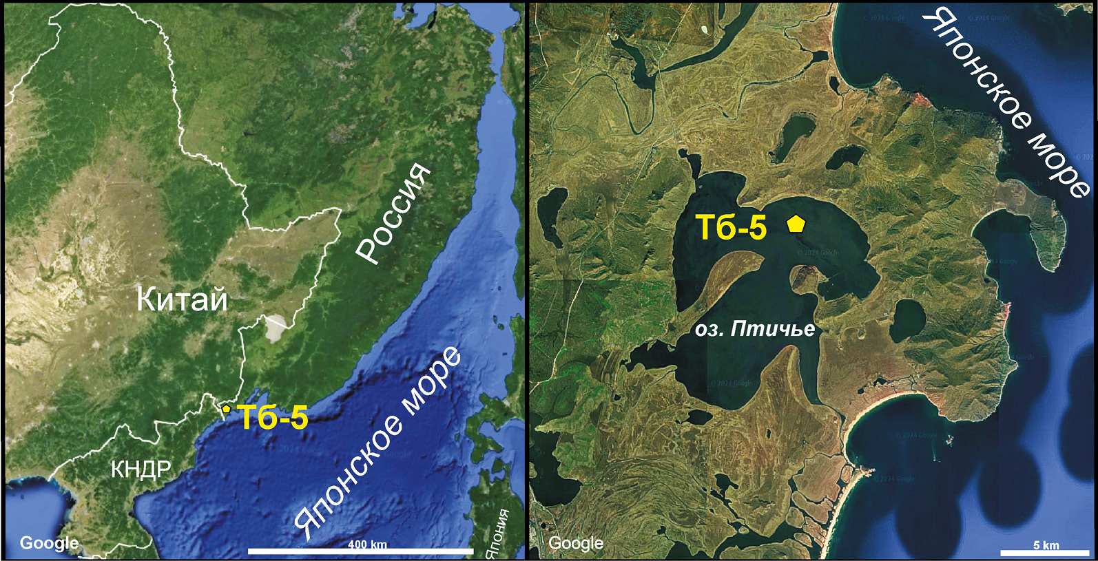 Рис. 1. Расположение изученной колонки Тб-5: оз. Птичье в Южном Приморье